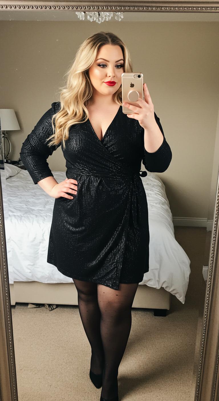 The subtle shimmer of the black wrap dress immediately catches the eye, offering a sophisticated yet festive appeal. Its classic silhouette, cinched at the waist, flatters various body types by creating an hourglass effect, especially complementary for pear or apple shapes. The three-quarter sleeves add a touch of elegance, while the textured fabric provides depth and visual interest, making it ideal for evening events or holiday gatherings. Paired with sheer black tights and pointed-toe heels, this ensemble is perfect for cocktail parties or a chic night out.
