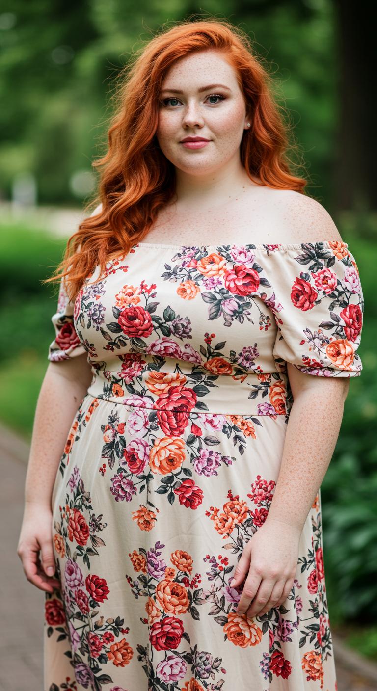 Exuding a charming and romantic sensibility, this maxi dress is perfect for warm-weather occasions. The off-the-shoulder neckline gracefully highlights the décolletage, while the vibrant floral print in shades of red, orange, and purple against a cream background creates a soft yet striking visual. Its flowing silhouette, cinched at the waist, would beautifully complement hourglass and pear body types, offering comfort and elegance for garden parties, brunches, or daytime events.
