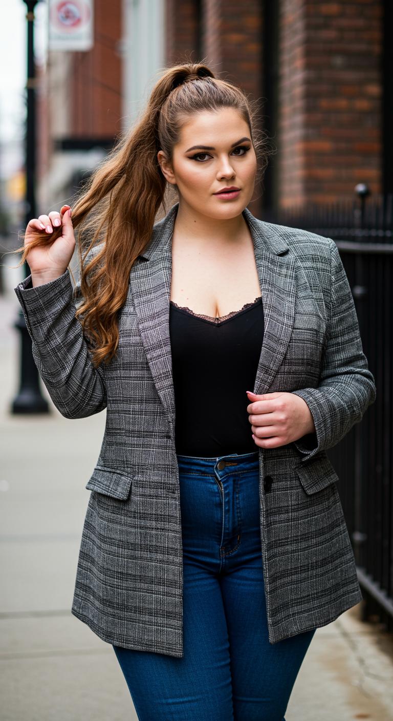 Perfect for a casual work environment, city errands, or a relaxed weekend brunch, this outfit combines comfort with undeniable style. The structured grey plaid blazer adds a sophisticated layer over a simple black lace-trimmed camisole, creating a balanced interplay of textures. Paired with well-fitting dark wash jeans, this versatile look flatters various body types by offering a tailored silhouette while maintaining ease of movement. It’s an excellent choice for those who appreciate classic patterns and a touch of effortless elegance in their everyday wardrobe.