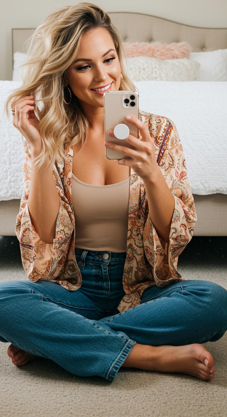 Layering a richly patterned kimono over a simple ribbed tank top creates an effortless, bohemian-inspired aesthetic. The warm, earthy tones of the kimono’s paisley print beautifully complement the neutral base, while high-waisted denim adds a relaxed yet polished foundation. This versatile combination is ideal for those who favor comfort with a touch of artistic flair and is perfectly suited for casual outings, weekend brunches, or relaxed vacation settings.