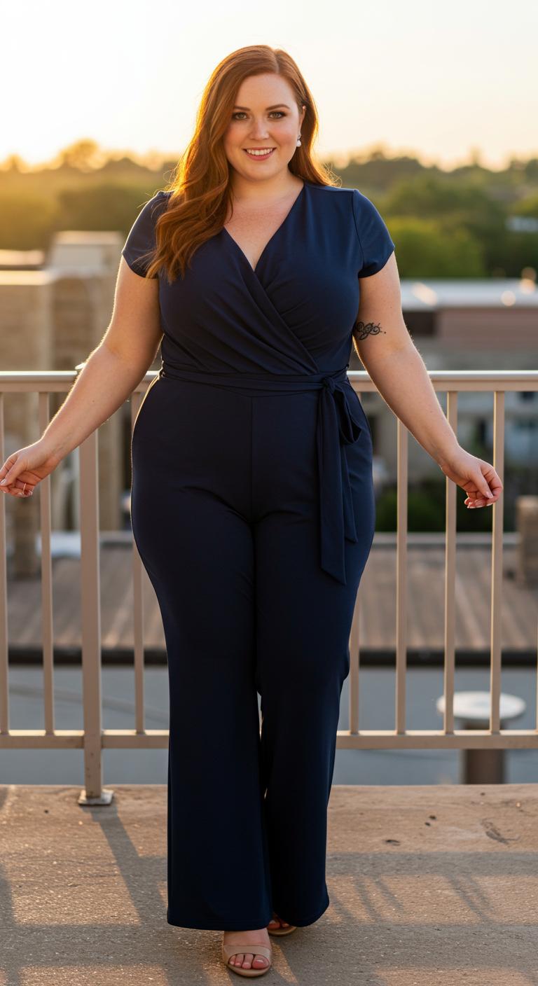 The seamless elegance of a one-piece garment is perfectly captured in this deep navy jumpsuit, offering both comfort and refined style. Its flattering wrap-style bodice with short sleeves and a cinched waist tie creates an hourglass silhouette, complementing various body types by accentuating the natural waist. The wide-leg trousers provide a graceful flow, making it ideal for semi-formal gatherings, evening events, or a sophisticated casual outing. This versatile piece requires minimal accessorizing to make a strong fashion statement.