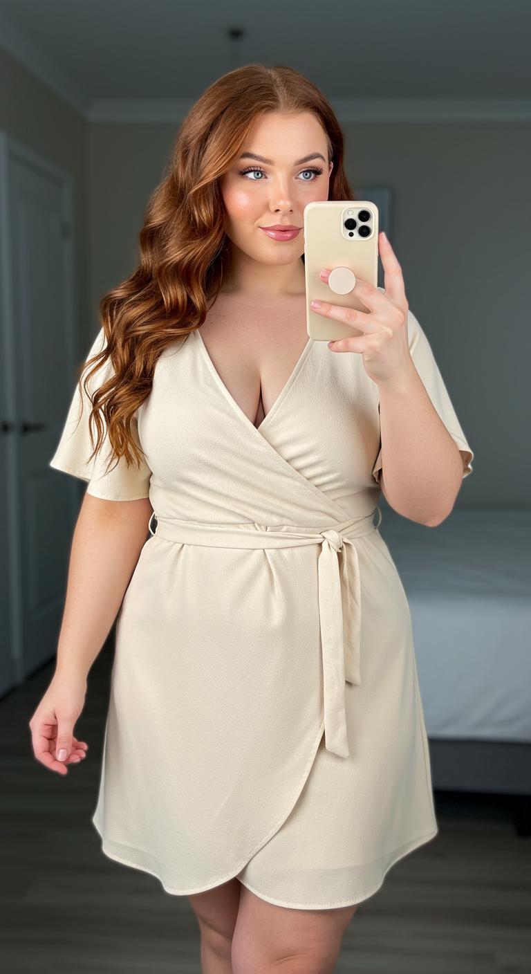 The softly textured fabric of this wrap dress offers a fluid drape that flatters various figures, particularly hourglass and pear shapes, by accentuating the waist. Its delicate cream hue provides a versatile base for accessorizing, making it suitable for both casual daytime outings and more refined evening events. The v-neckline and flutter sleeves add a touch of feminine grace, ensuring comfort without sacrificing style. This piece is ideal for those who favor understated elegance and effortless dressing.