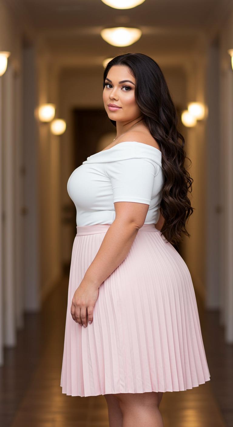 The crisp white off-shoulder top and the flowing blush pleated skirt harmonize to create a balanced, elegant silhouette. The fitted bodice accentuates the upper body, while the midi-length skirt adds movement and a touch of classic femininity. This pairing would flatter those with an hourglass or pear body shape, offering a sophisticated aesthetic suitable for a brunch date, a daytime event, or an elevated casual outing.
