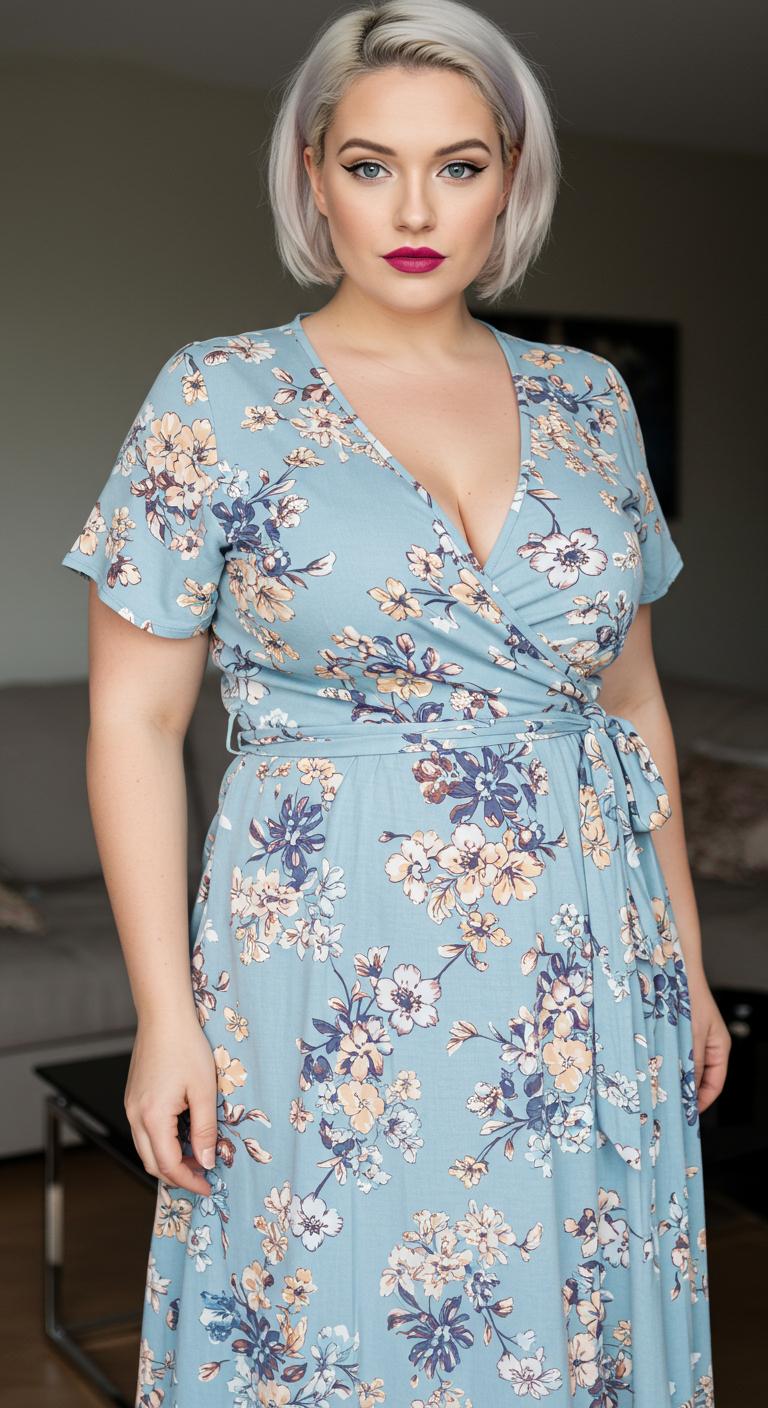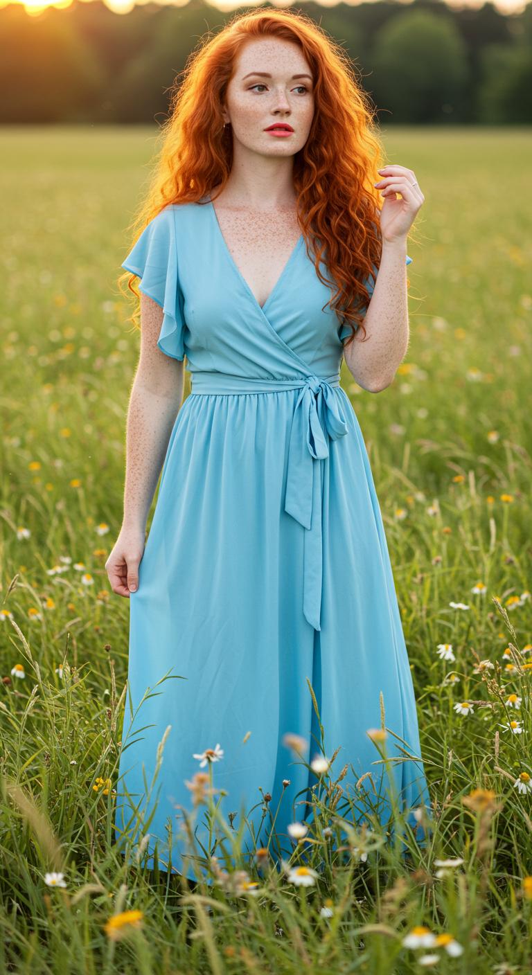 The unique charm of this ensemble lies in its serene azure hue and flattering wrap silhouette, offering both comfort and sophisticated style. The V-neckline and flutter sleeves add a delicate touch, while the cinched waist with a tie accentuates the figure beautifully. This flowing maxi dress would gracefully complement most body types, especially those with an hourglass or pear shape, and is ideal for garden parties, outdoor events, or a chic daytime look.