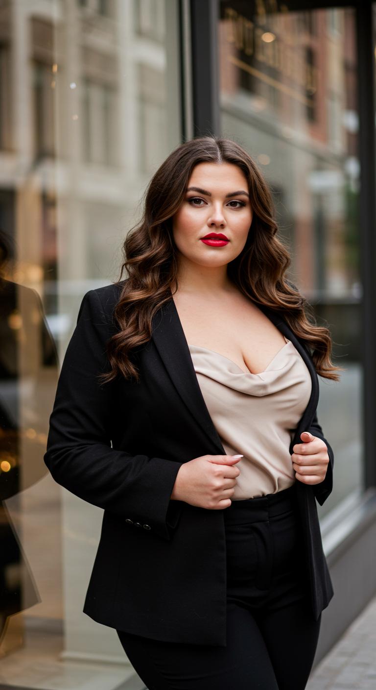 The sophisticated interplay of black and champagne creates a refined aesthetic. A sharp black blazer and coordinating trousers form a polished foundation, while the champagne-hued cowl neck camisole adds a touch of delicate allure and textural contrast. This combination offers a confident yet feminine statement, perfect for those with an hourglass or pear body shape who appreciate an elegant, modern business casual or evening event look. The relaxed drape of the satin against the structured tailoring works beautifully for a professional gathering or an upscale dinner.