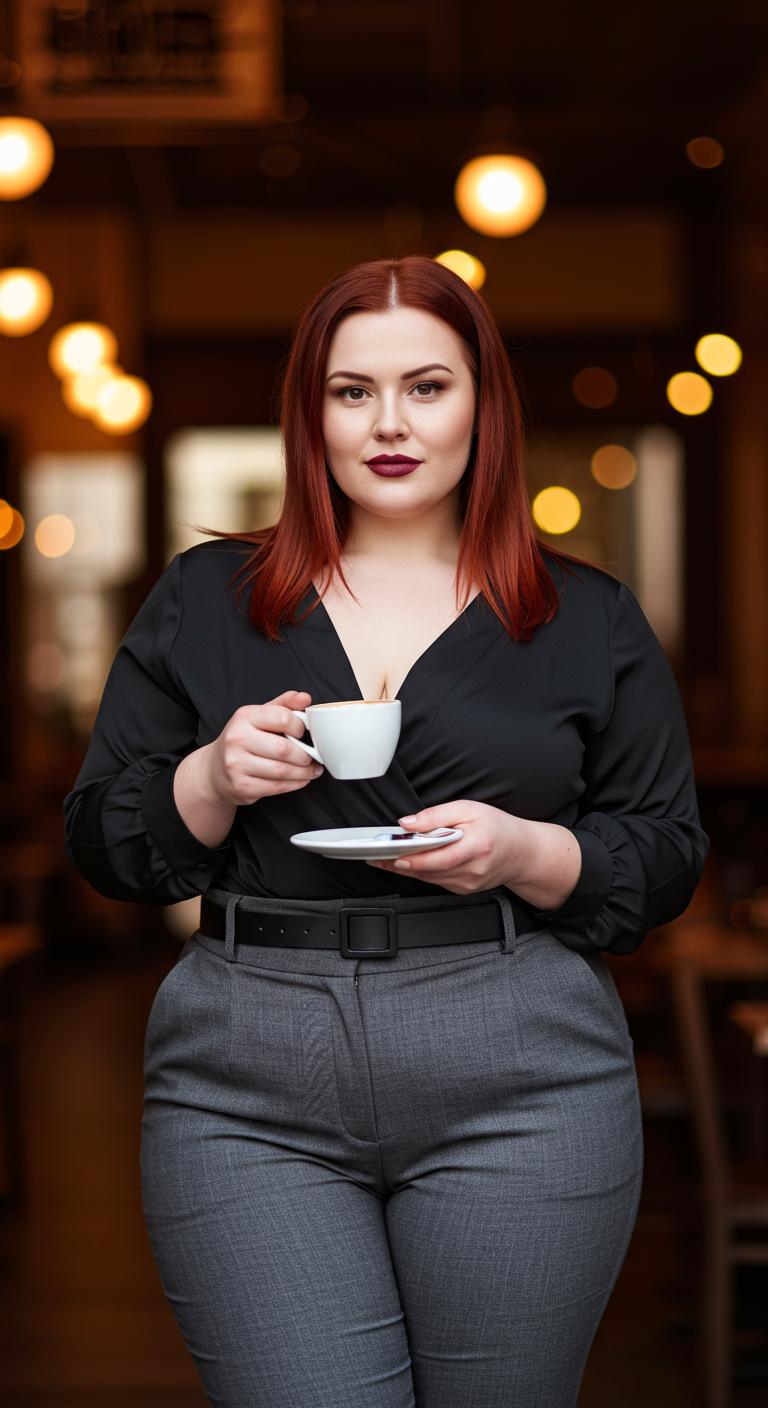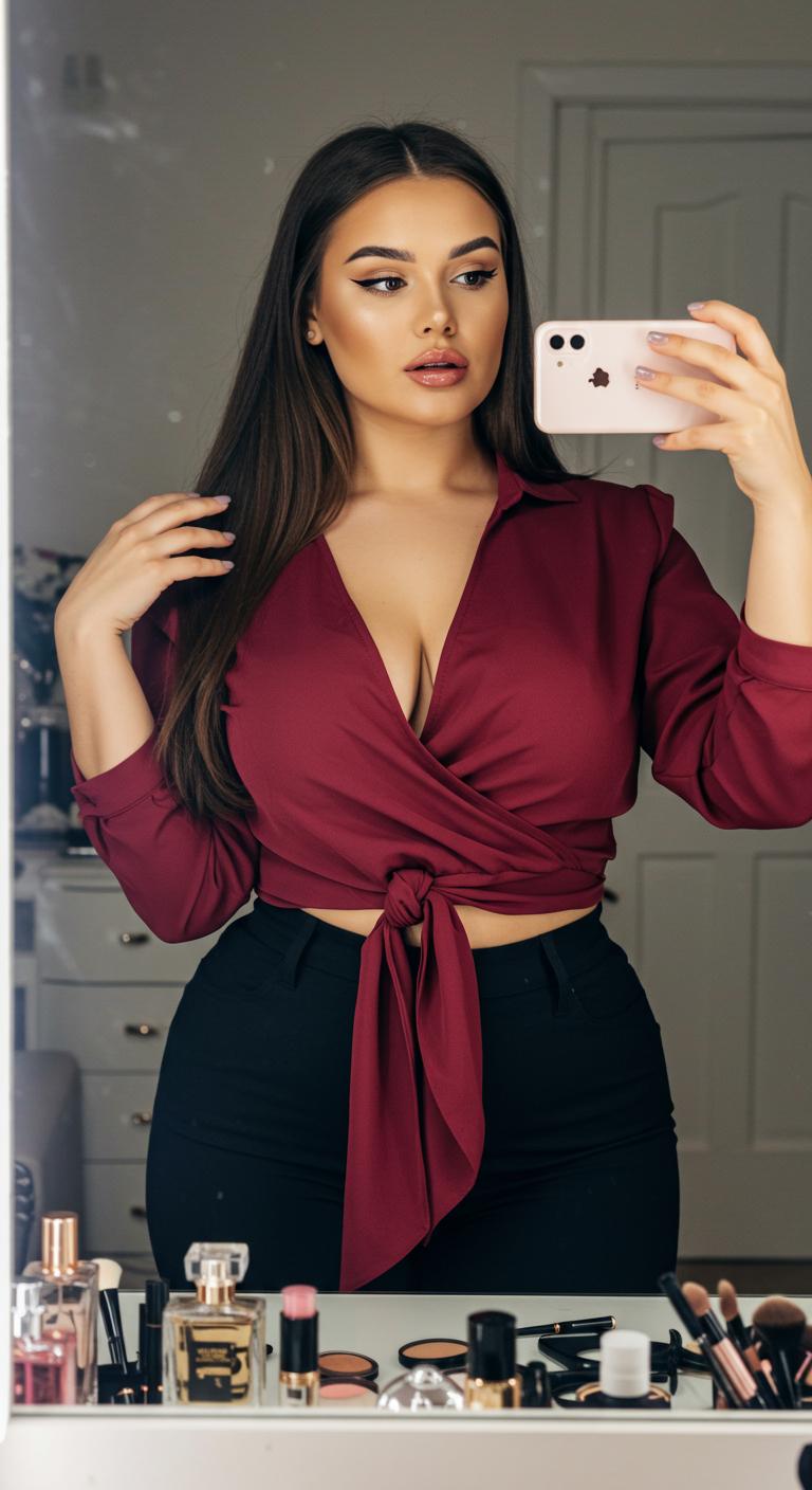 Perfect for cooler transitional weather, this ensemble offers a sophisticated yet alluring aesthetic. The deep burgundy long-sleeved wrap top, tied neatly at the waist, creates a flattering hourglass silhouette, complementing pear, hourglass, and inverted triangle body types beautifully. Paired with tailored black trousers, the outfit balances rich color with classic structure, making it ideal for a business-casual office setting, an evening dinner, or a stylish social event.