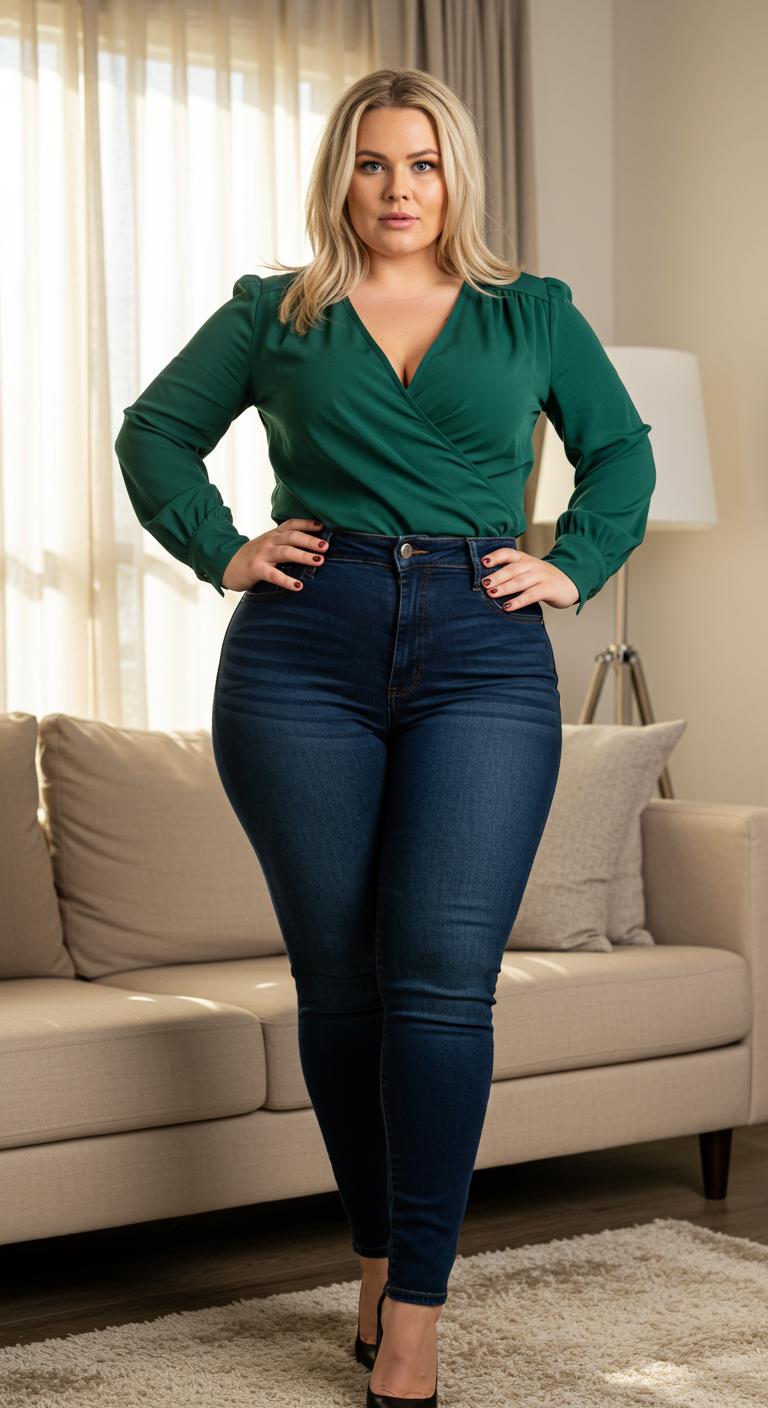 The rich emerald green wrap blouse anchors this sophisticated casual look, offering a flattering V-neckline and gentle puff sleeves that add a touch of refined femininity. Paired with dark wash skinny jeans, the silhouette is streamlined and chic, ideal for accentuating an hourglass figure or creating definition. This versatile combination is perfect for a stylish daytime event, a casual office setting, or an evening out, balancing comfort with polished appeal.