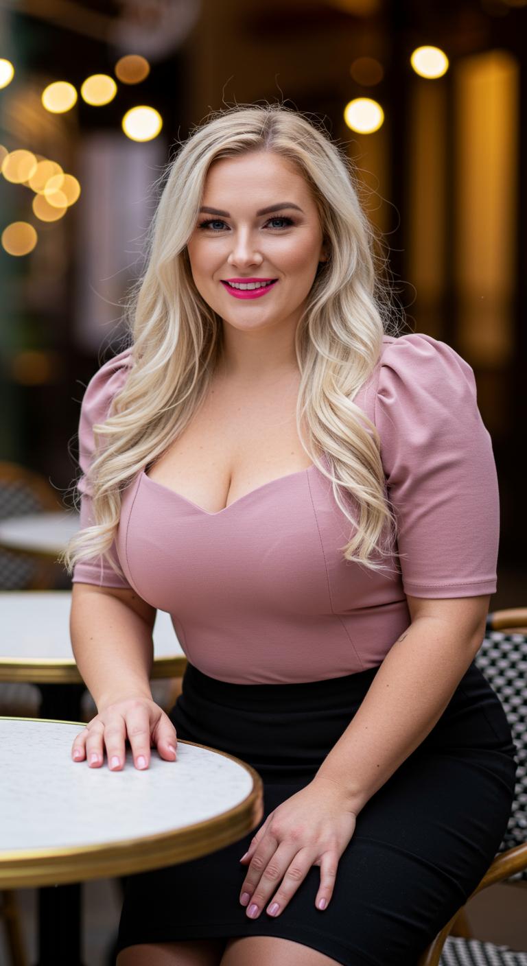 The sweetheart neckline of the soft mauve top immediately draws the eye, offering a flattering silhouette complemented by delicate puff sleeves that add a touch of romantic charm. Paired with a sleek black pencil skirt, the ensemble strikes a sophisticated balance between playful and polished. This look is perfect for pear or hourglass figures, enhancing curves while remaining appropriate for a stylish brunch or an evening out.