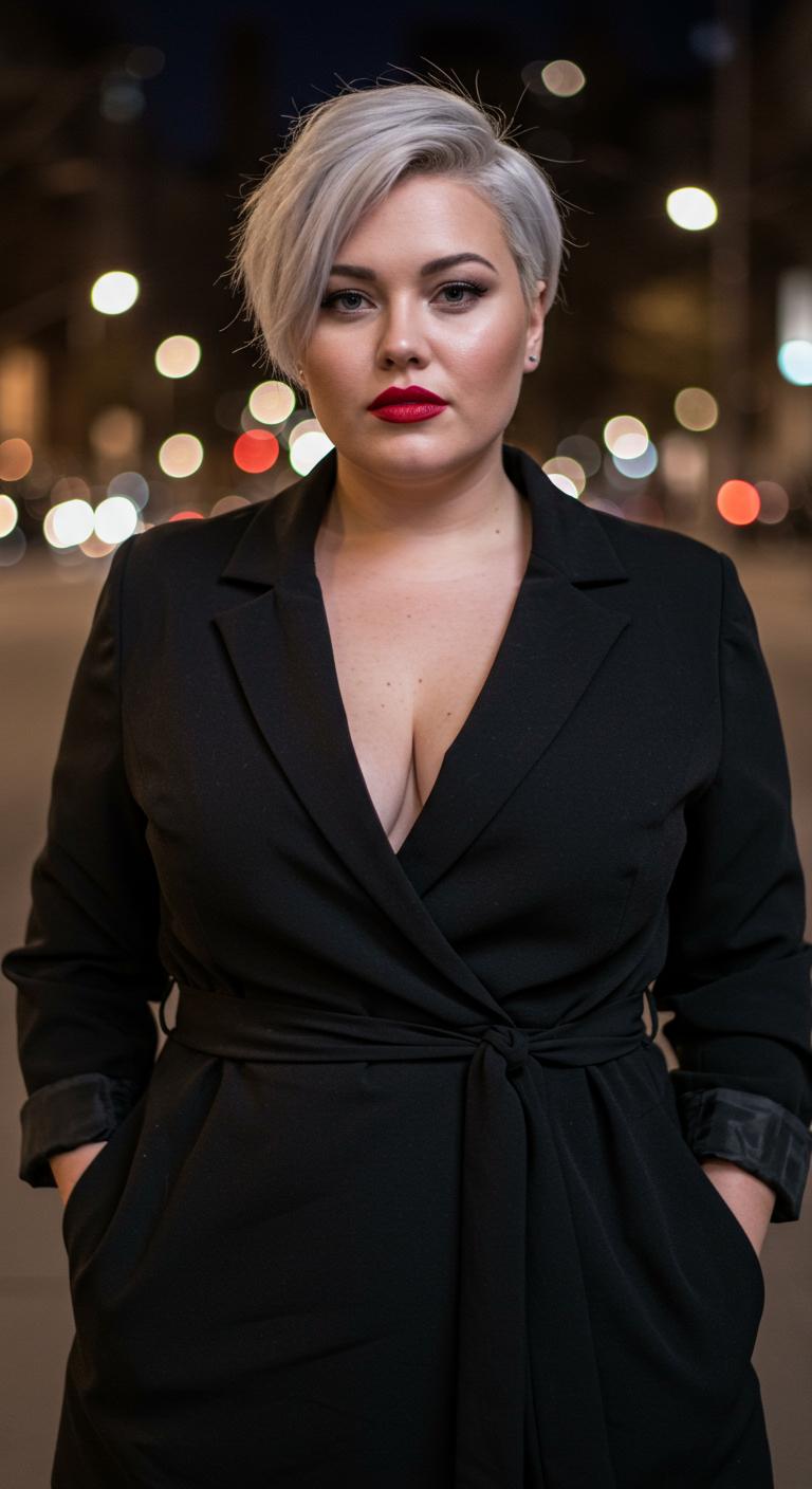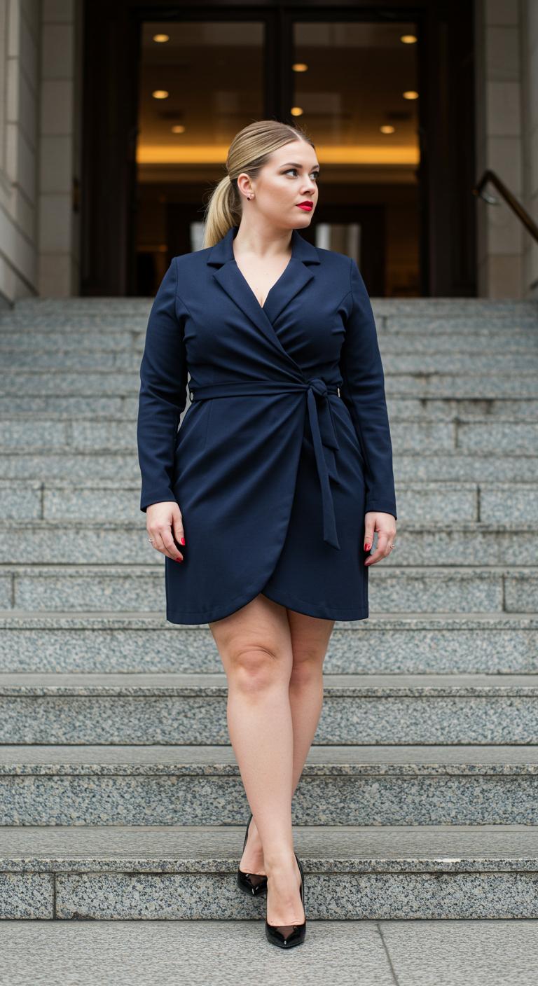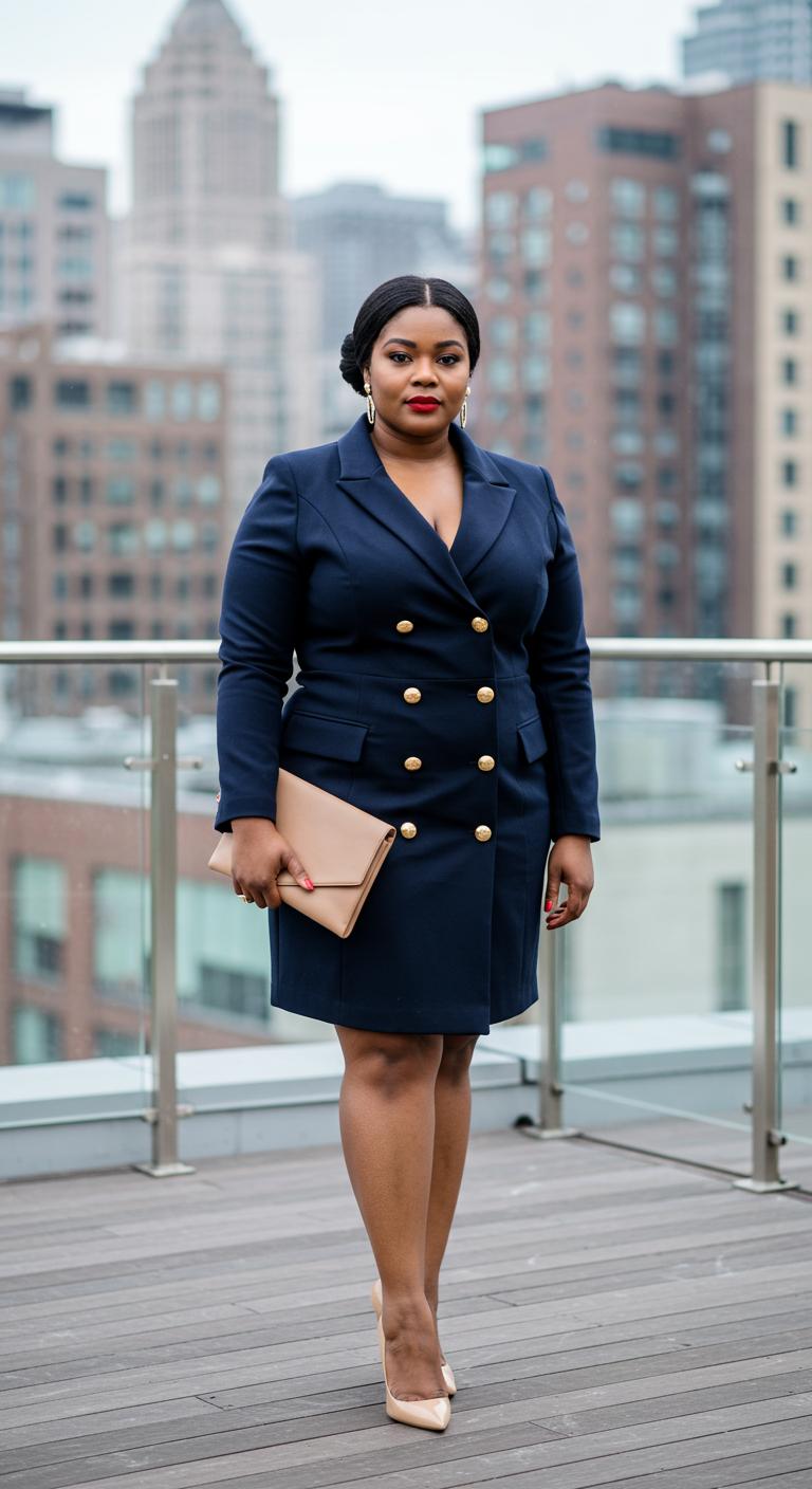 For a powerful presentation or a sophisticated business lunch, the navy double-breasted blazer dress offers an impeccable blend of professionalism and style. The structured silhouette with its prominent gold buttons creates a commanding presence, while the tailored fit gracefully defines the waist, flattering various body types. Paired with nude heels and a matching clutch, this ensemble exudes polished confidence and is perfect for the fashion-conscious woman seeking a refined yet impactful statement.