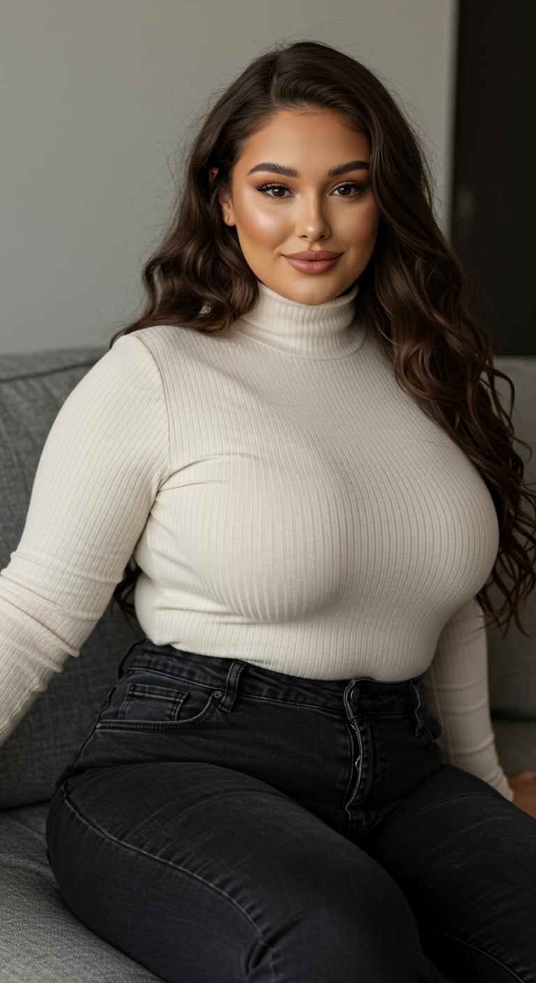 For a relaxed yet refined day out, a sophisticated ribbed turtleneck in an off-white hue pairs seamlessly with dark wash denim. The fitted top, with its subtle texture, offers a flattering silhouette that complements various body types, particularly those seeking to highlight their upper body. This combination of soft, neutral tones and classic denim creates an effortlessly put-together aesthetic, ideal for casual brunches, coffee dates, or a comfortable work-from-home ensemble.