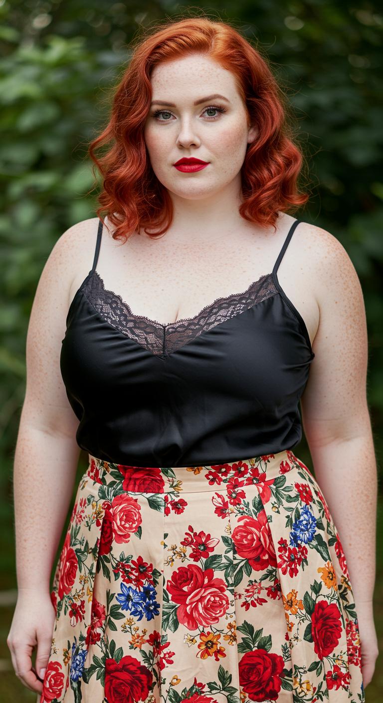 The art of balancing bold patterns with sleek simplicity is evident here, pairing a vibrant floral skirt with a classic black camisole. The full, pleated silhouette of the skirt, rich with red and blue blossoms on a neutral base, offers a playful yet refined aesthetic. This combination beautifully complements hourglass and pear body types, accentuating the waist while allowing for comfortable movement. Ideal for a garden party, a casual brunch, or an evening out, this outfit strikes a perfect balance between sophisticated and approachable.