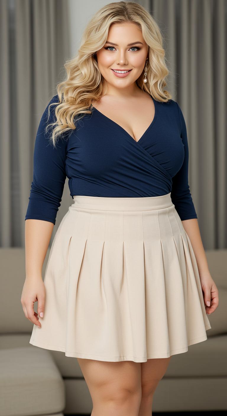 The striking contrast between the deep navy top and the light beige skirt creates a sophisticated yet playful aesthetic. The wrap-style top with three-quarter sleeves offers a flattering silhouette, complemented by the structured pleats of the mini skirt. This combination would suit various body types, particularly those looking to highlight their waist, and is perfect for casual outings, daytime events, or semi-formal gatherings where comfort meets elegance.