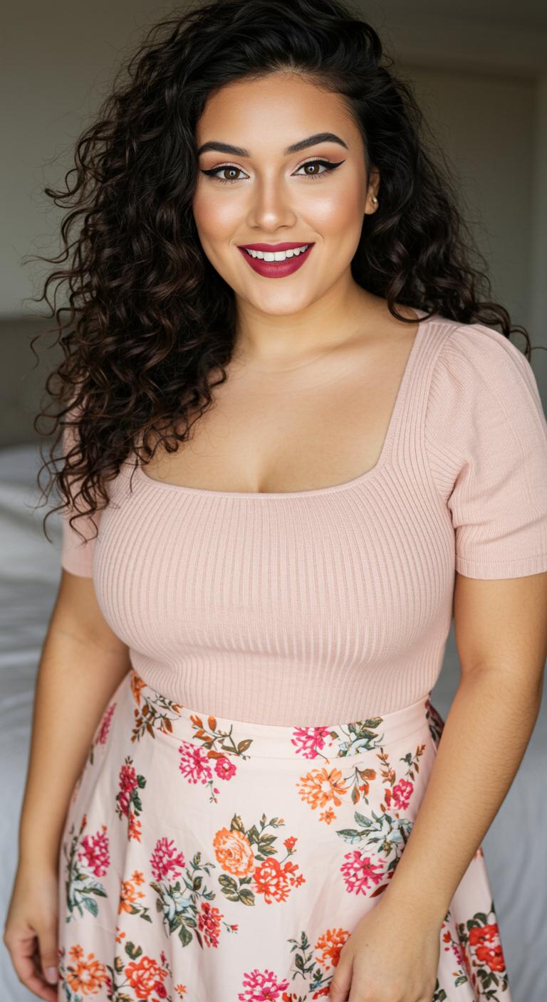 Exuding a fresh and feminine charm, this outfit perfectly balances structure with playful prints. The fitted, light pink ribbed top with its square neckline offers a flattering silhouette, while the flowing floral skirt introduces a vibrant, romantic touch. This combination works exceptionally well for those who appreciate a classic yet lively aesthetic, suitable for pear or hourglass body types. It’s an ideal choice for a daytime social event, a casual brunch, or a springtime garden party.