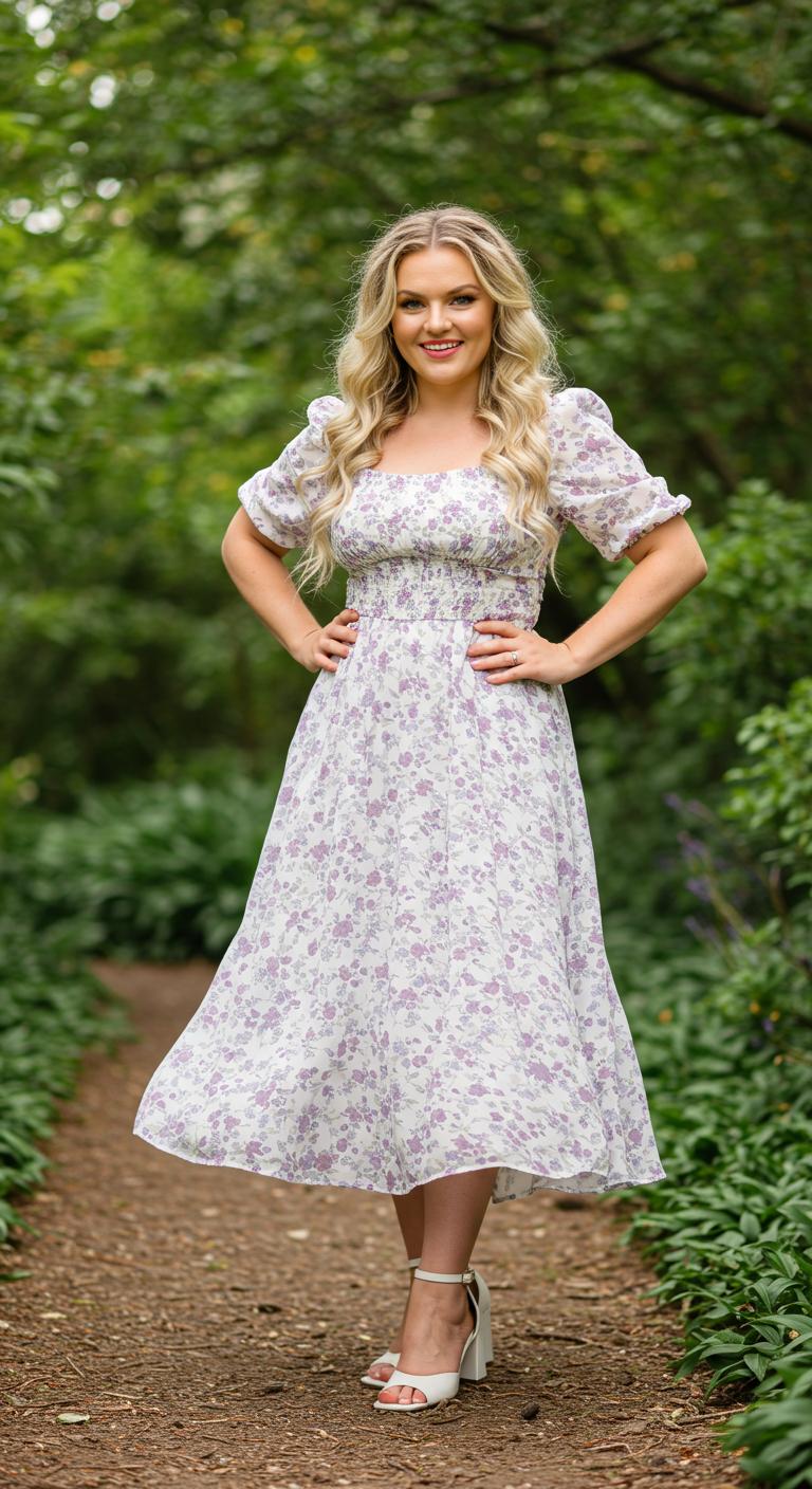 Perfect for warm weather, this midi dress offers a delightful blend of comfort and feminine charm, ideal for a garden party or outdoor brunch. The delicate white fabric, adorned with a subtle purple floral print, creates a refreshing and airy aesthetic. Its square neckline and softly puffed sleeves add a touch of romantic vintage appeal, while the shirred bodice gently accentuates the waist before flowing into a graceful A-line skirt. This universally flattering silhouette complements various body types, particularly those seeking to highlight their décolletage and achieve a relaxed yet polished look.