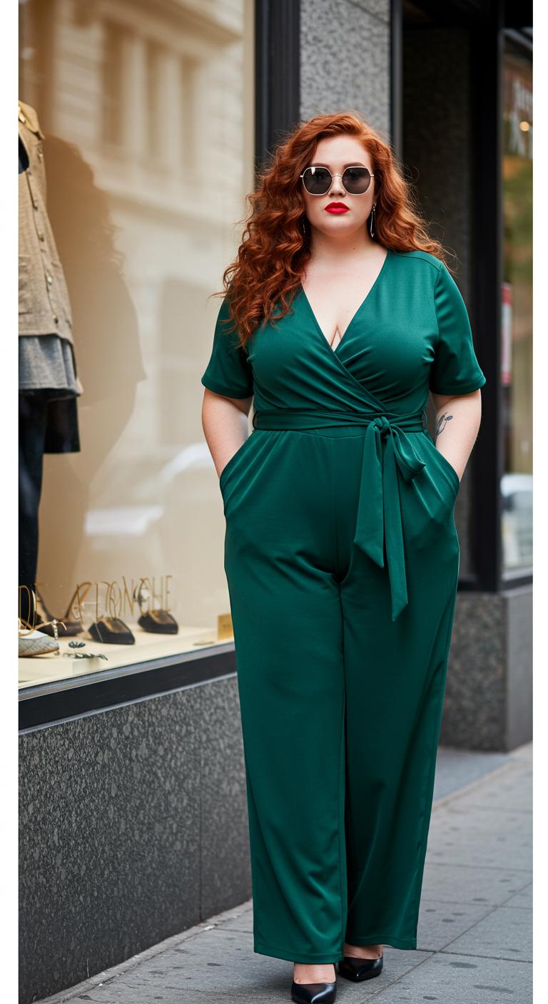 Echoing the relaxed yet polished vibe of 1970s resort wear, this emerald green jumpsuit offers effortless sophistication. The wrap-style bodice and wide-leg trousers create a flattering silhouette that elongates the figure, making it suitable for various body types, particularly those seeking to balance proportions. Its rich color and fluid fabric make it an ideal choice for smart casual gatherings, evening events, or even stylish daytime city excursions when paired with minimalist accessories.