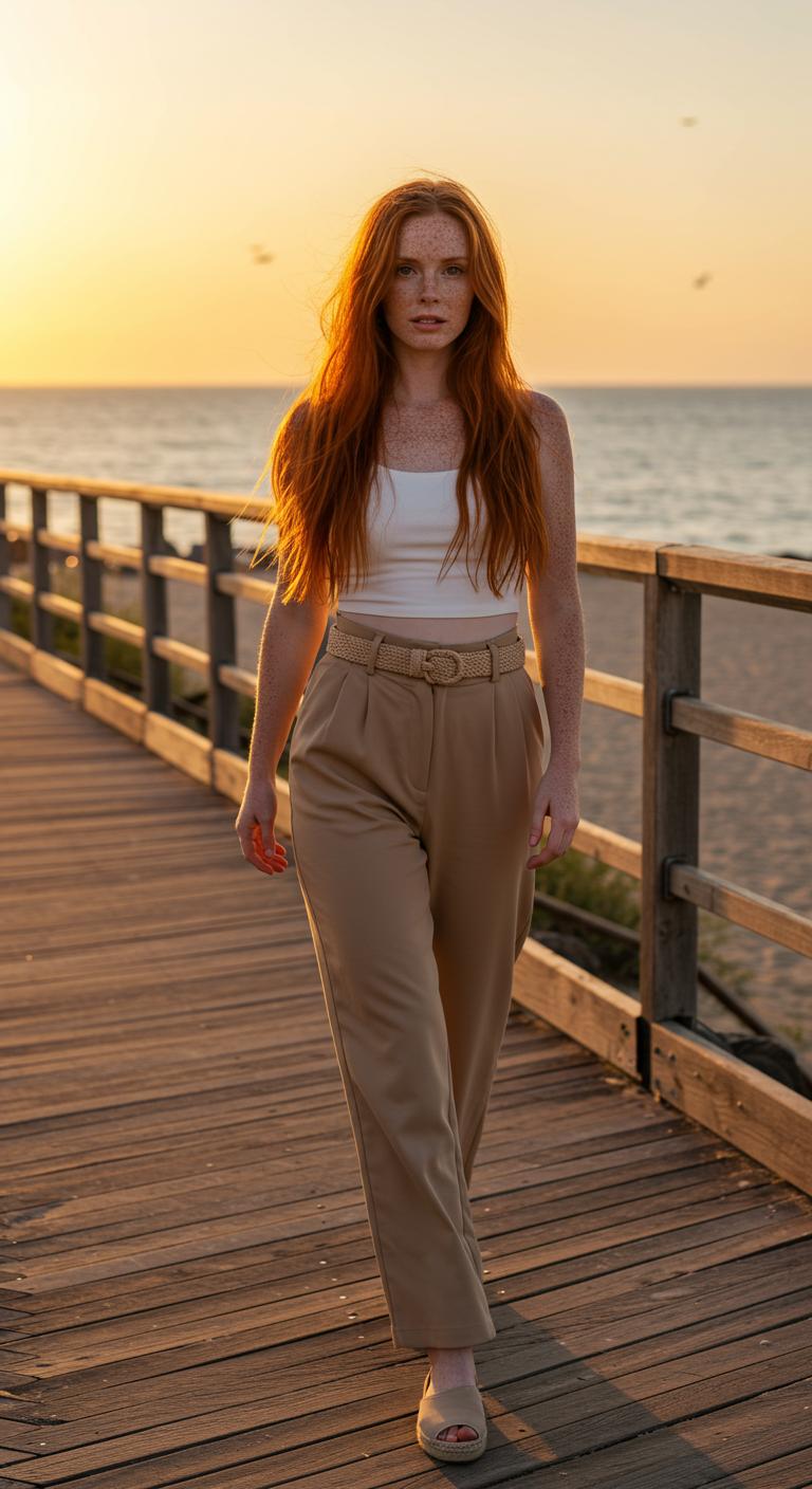The woven belt, a key detail, cinches the high-waisted, pleated trousers, creating a defined silhouette. Paired with a simple white crop top and espadrille wedges, this ensemble strikes a balance between relaxed and refined. It’s an ideal choice for women seeking a comfortable yet stylish look for casual outings, resort wear, or a relaxed evening stroll, particularly flattering for those who appreciate a well-defined waist and flowing lines.