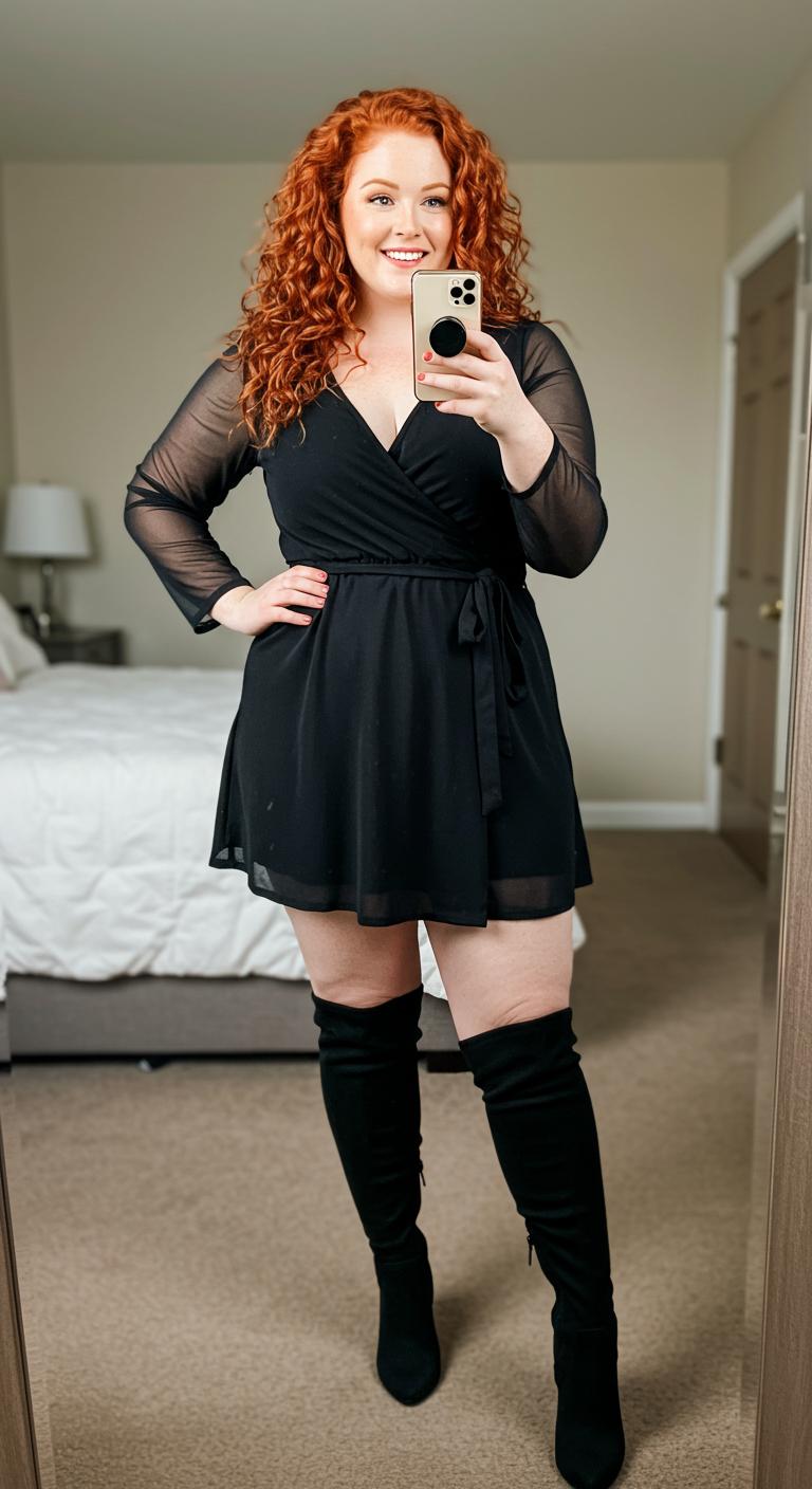The interplay of textures in this all-black ensemble truly elevates its appeal, featuring a wrap dress with sheer long sleeves that add a delicate contrast. This silhouette, cinched at the waist, flatters various body types by creating an hourglass effect, making it particularly suitable for those seeking to define their waistline. Paired with sleek over-the-knee boots, the outfit achieves a sophisticated yet playful balance, ideal for evening events, cocktail parties, or a stylish night out.