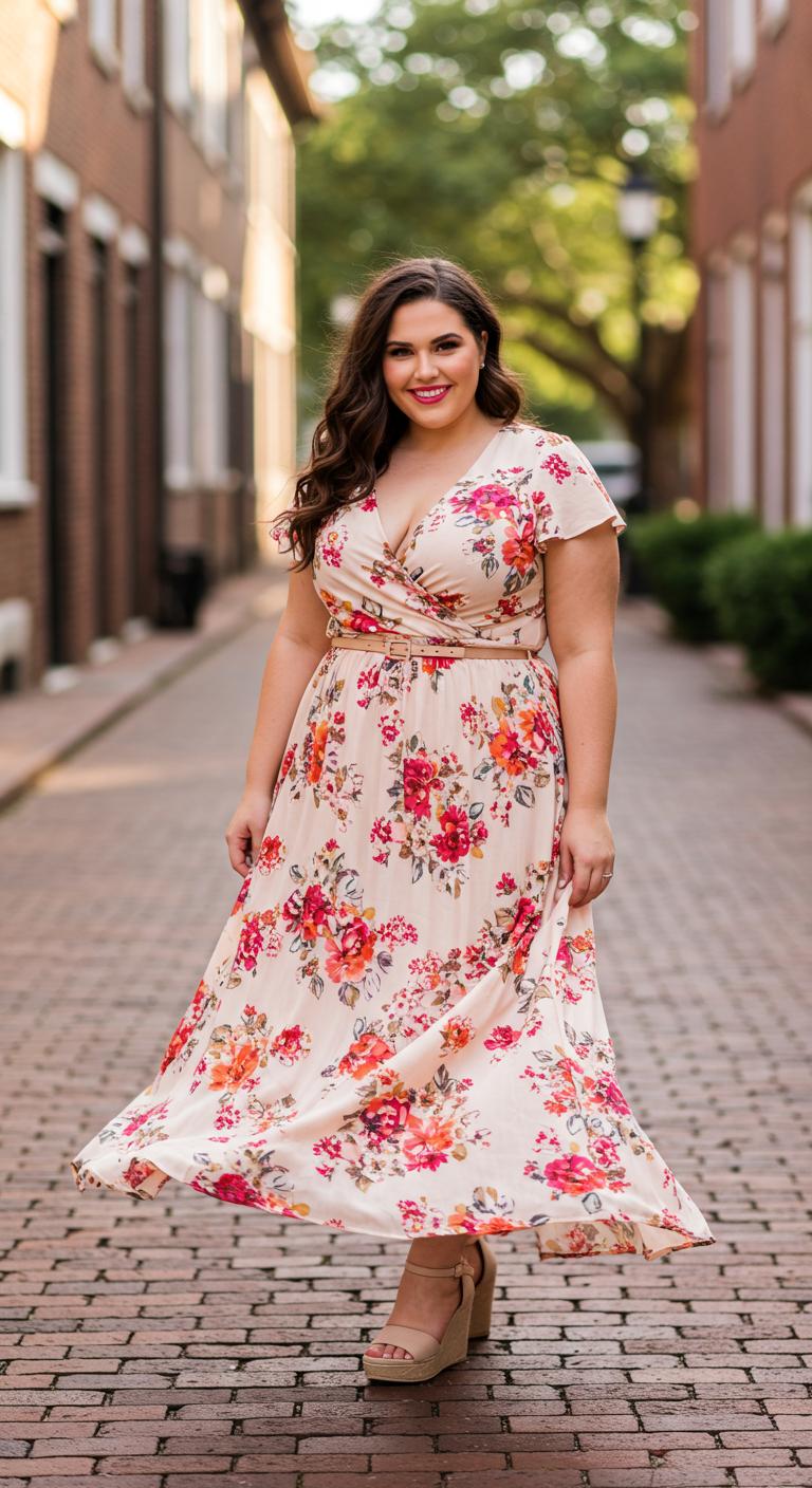The soft, flowing fabric of this floral maxi dress creates an effortlessly elegant silhouette. A wrap-style bodice and a subtle belted waist define the figure, making it suitable for hourglass, pear, or apple body types, while the full skirt offers comfortable movement. The delicate blush base with vibrant coral and fuchsia blooms exudes a charming, feminine aesthetic. This versatile ensemble is ideal for garden parties, brunch dates, or warm-weather casual events, pairing seamlessly with espadrille wedges for a refined yet relaxed feel.
