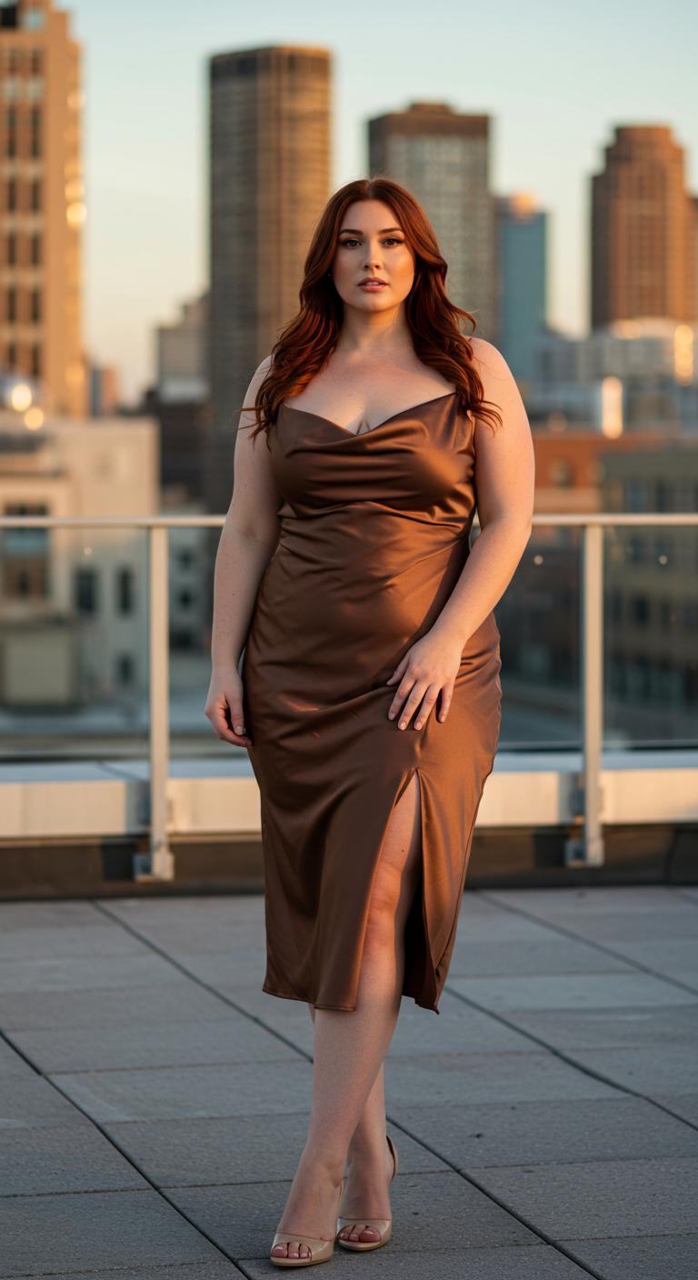 The subtle cowl neck of this midi slip dress offers a touch of elegant draping, perfectly complementing the rich, warm brown satin fabric. Its figure-skimming silhouette, accentuated by a daring thigh-high slit, creates a sophisticated yet alluring aesthetic. This ensemble is ideal for hourglass or pear-shaped figures, enhancing curves with its gentle flow and adding a refined touch to evening events, cocktail parties, or upscale dinner dates.