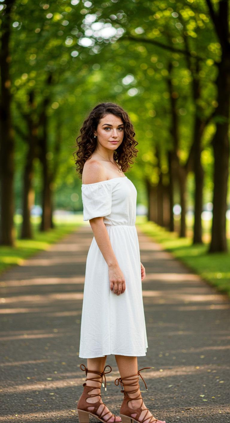 A lighthearted and airy mood defines this summer-ready ensemble, perfect for embracing warm weather. The off-the-shoulder white midi dress, featuring a relaxed silhouette and cinched waist, offers a universally flattering fit that complements most body types, particularly those seeking comfort without sacrificing style. Its clean, crisp color provides a versatile base, beautifully contrasted by the rich, earthy tone of the lace-up block heel sandals. This outfit is ideal for a casual brunch, a leisurely stroll through a park, or an outdoor market, embodying a chic yet approachable aesthetic.