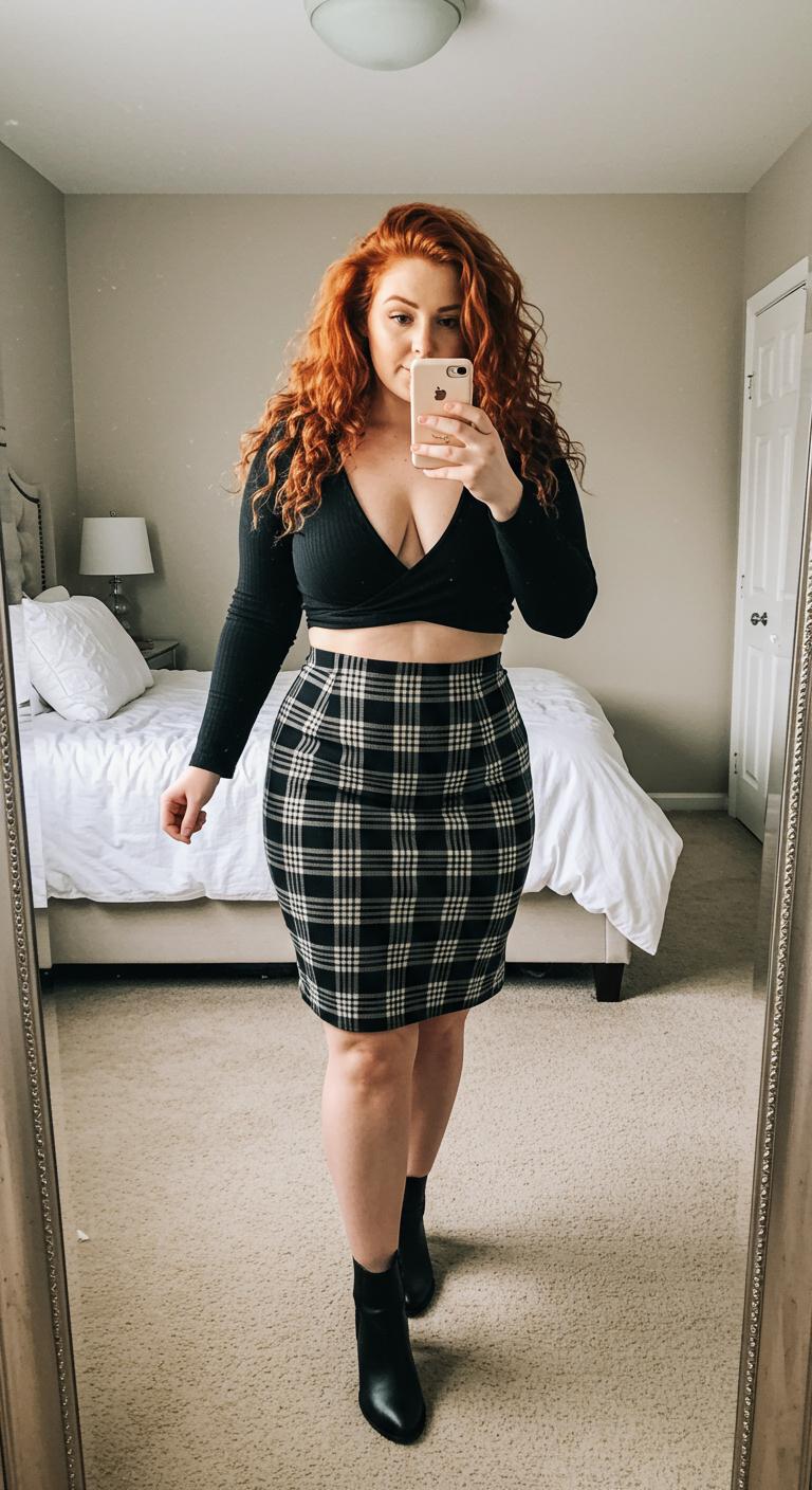 Perfect for a casual evening out or a relaxed social gathering, this ensemble balances playful print with sleek lines. A ribbed black long-sleeve crop top with a deep V-neck creates a modern silhouette, complementing the high-waisted plaid pencil skirt. The skirt, featuring a classic black and cream check pattern, adds a touch of sophistication and works beautifully to accentuate an hourglass figure. Paired with black ankle boots, the outfit achieves an effortlessly stylish appeal for those who appreciate a blend of contemporary and timeless elements.