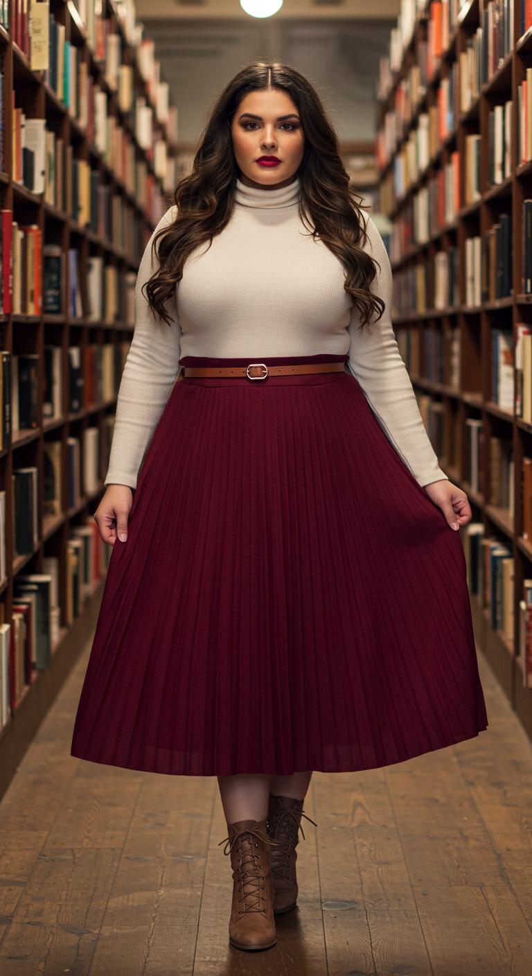 The unique combination of a ribbed ivory turtleneck with a rich burgundy pleated midi skirt creates a sophisticated yet approachable aesthetic. This pairing, cinched with a slim tan belt, beautifully defines the waist, making it ideal for hourglass or pear body types seeking to highlight their silhouette. The outfit’s warm tones and classic structure make it perfectly suited for professional casual settings, cultural events, or a cozy autumn day out, offering both comfort and refined elegance.