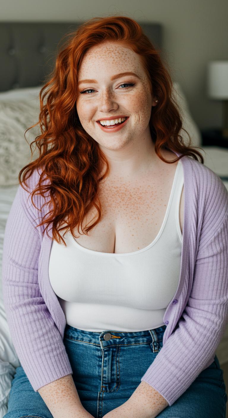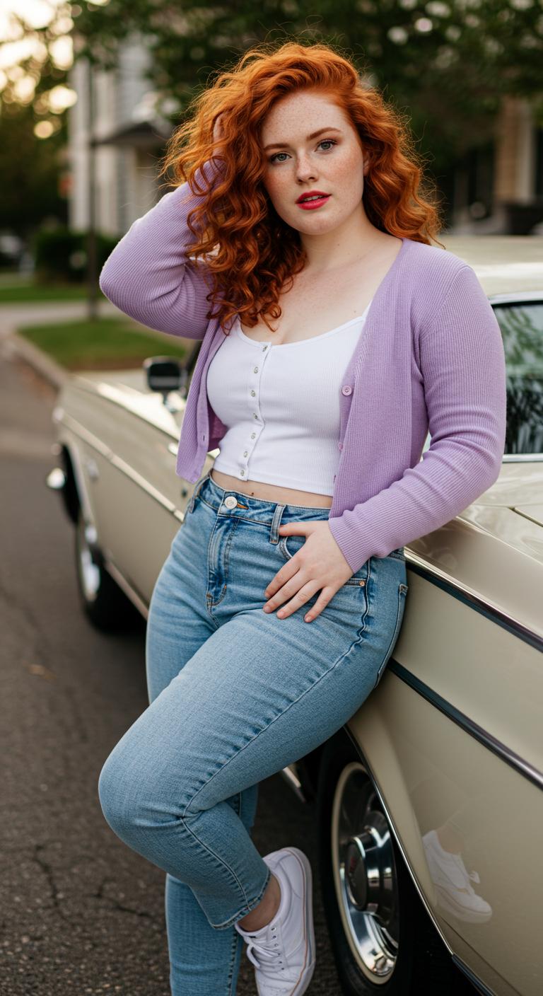 The soft lavender cardigan and light-wash denim create a harmonious balance of casual comfort and subtle color. This ensemble, featuring a fitted white ribbed top, accentuates natural curves while providing an approachable, relaxed vibe. It’s an ideal choice for a casual daytime outing or a relaxed evening gathering, particularly suiting those who appreciate effortless style and a touch of pastel charm.