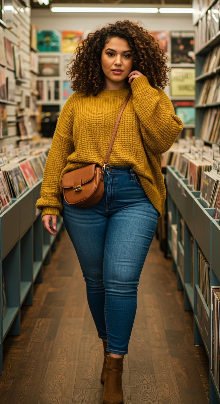 Drawing inspiration from classic American casual wear, this look elevates everyday comfort with thoughtful color play. The rich mustard cable-knit sweater, with its relaxed silhouette, pairs seamlessly with slim-fit indigo jeans, creating a balanced and approachable aesthetic. Complementary brown ankle boots and a matching crossbody bag tie the warm tones together, making it ideal for pear or hourglass body types seeking both style and ease. It’s a perfect choice for casual outings like weekend brunch or a relaxed afternoon exploring, offering effortless polish.