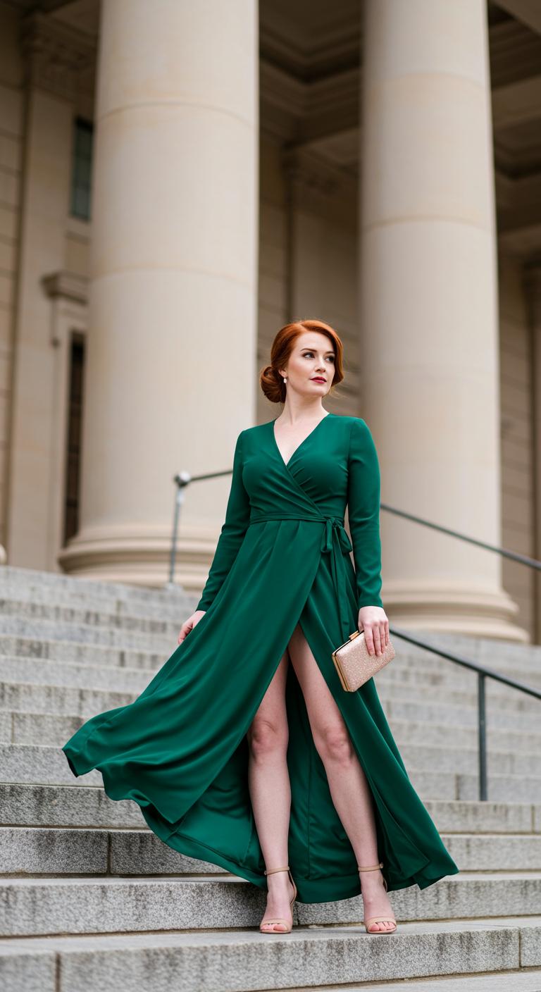 The rich emerald green of this floor-length wrap dress works harmoniously with its flowing silhouette, creating a sophisticated and striking evening look. The V-neckline and adjustable waist tie flatter a variety of body types, particularly accentuating an hourglass figure or creating definition for straighter builds. Paired with nude heels and a shimmering clutch, the ensemble is ideal for formal events, galas, or upscale evening gatherings, offering a blend of classic allure and modern confidence.