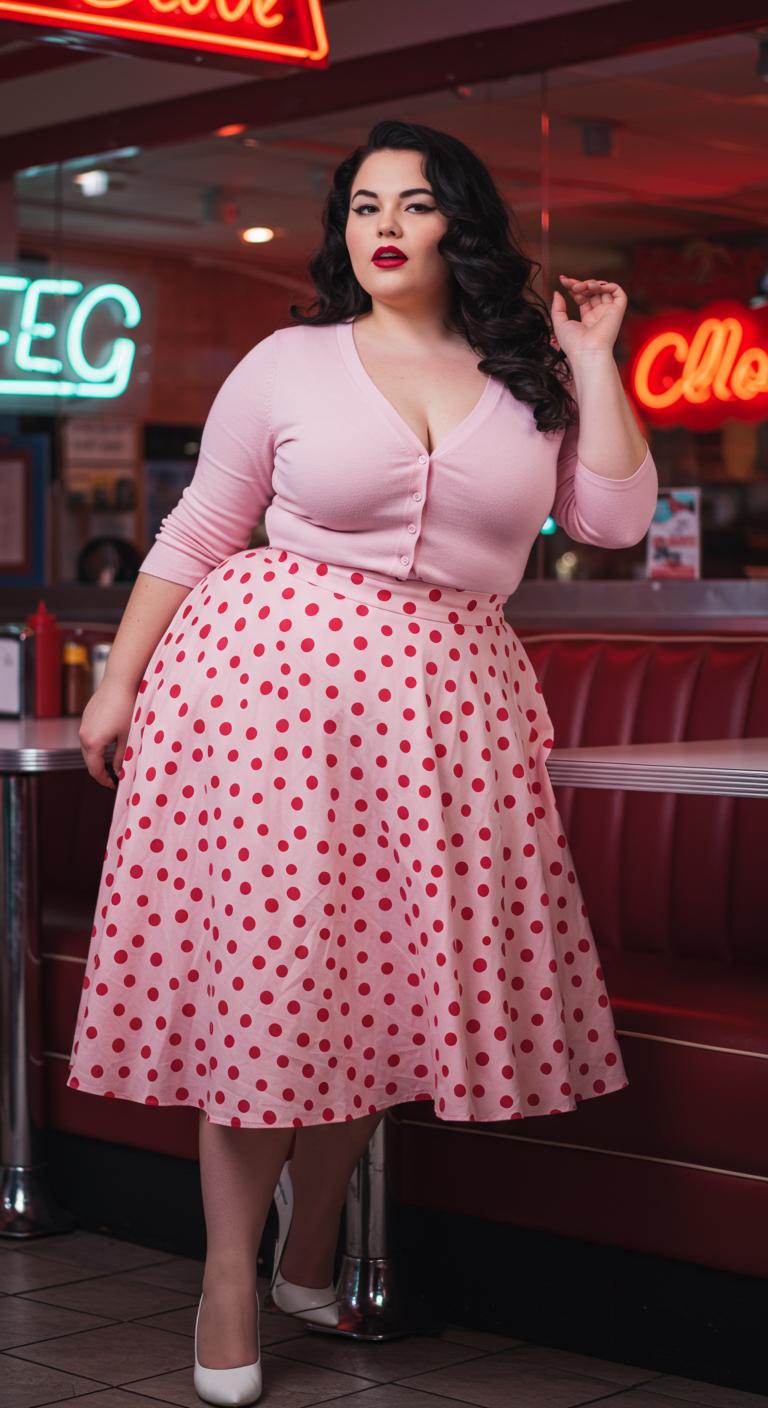 The harmonious blend of soft pink and vibrant cherry red creates a charming, retro-inspired aesthetic. A fitted, pastel pink cardigan with a subtle V-neckline complements the voluminous midi skirt, which features a playful polka dot print. This silhouette, with its cinched waist and full skirt, beautifully enhances an hourglass figure and flatters pear and apple body types by defining the waist and gliding over hips. Ideal for a relaxed brunch, a casual daytime event, or a vintage-themed gathering, this ensemble exudes a delightful, feminine appeal.