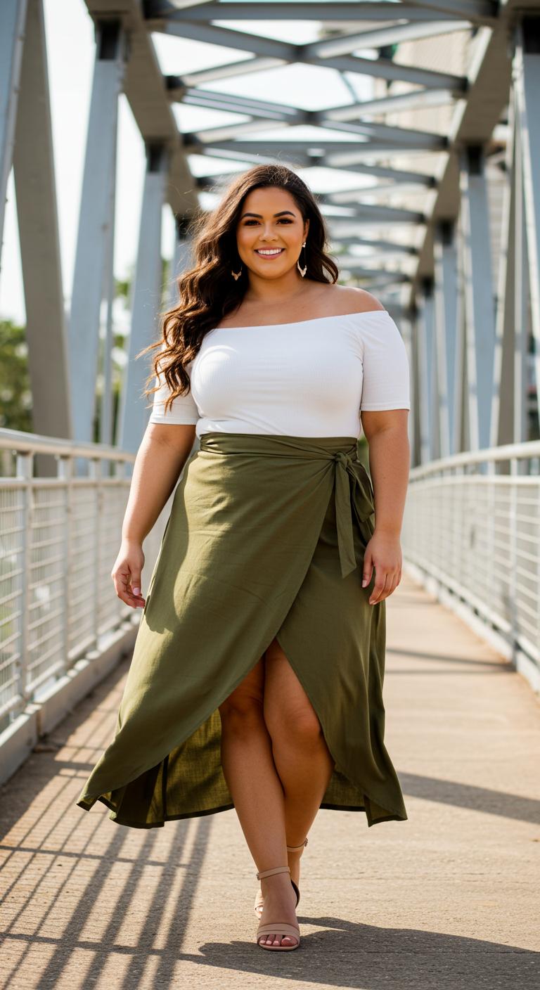 Perfect for a casual daytime outing or a relaxed brunch, the pairing of an off-the-shoulder white top with an olive green wrap skirt offers a balanced and approachable aesthetic. The crisp white provides a fresh contrast to the earthy olive tone, while the wrap silhouette of the skirt introduces movement and a flattering high-low hem. This versatile combination is ideal for various body types, particularly those who appreciate comfort without compromising on contemporary style, and can be effortlessly dressed up or down with accessory changes.