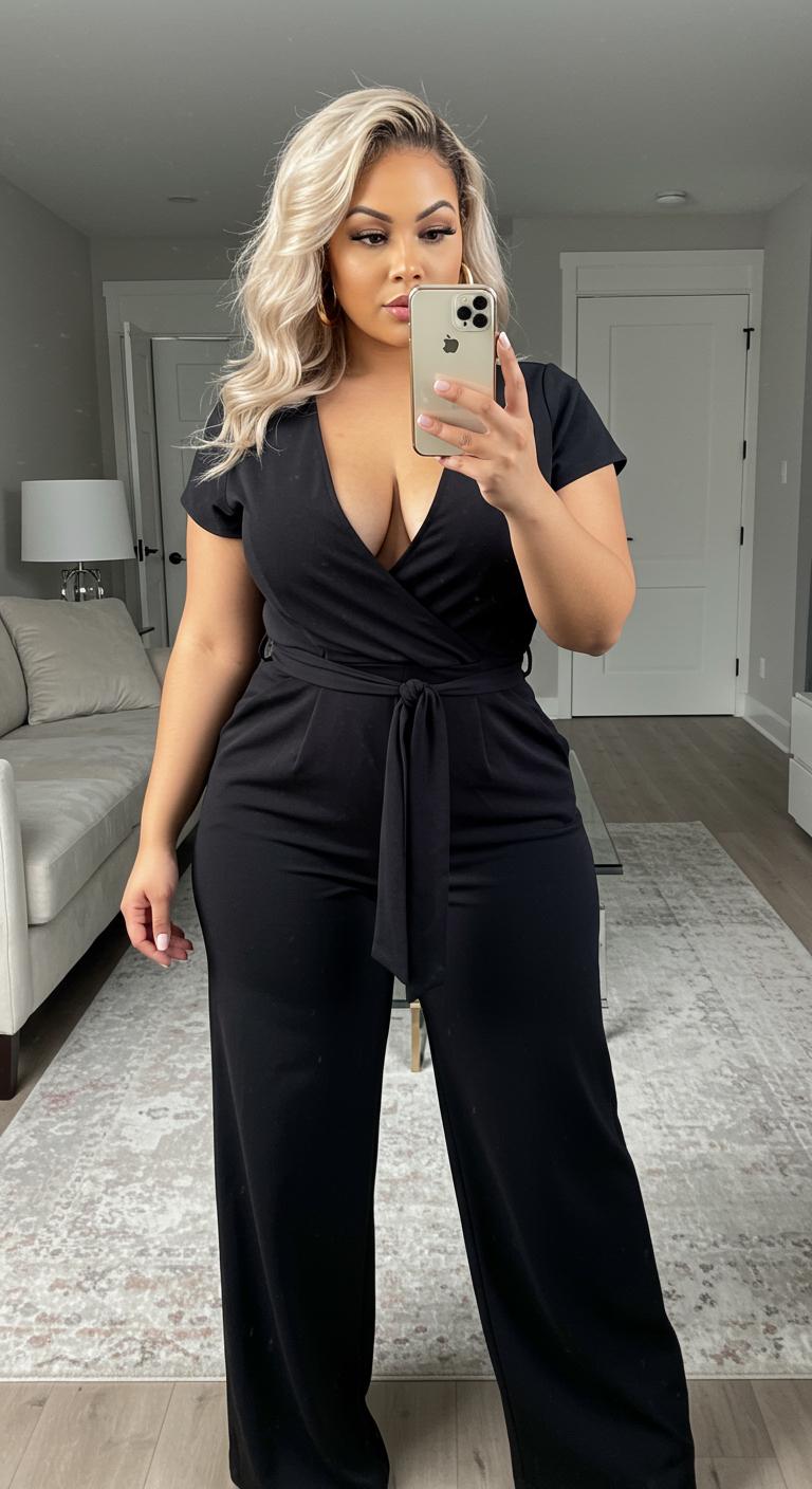 The strategic wrap-front design of this black jumpsuit cinches at the waist, creating an hourglass silhouette that flatters a variety of body types, particularly those seeking to define their midsection. Its deep V-neckline and wide-leg trousers offer a sophisticated balance, providing both allure and comfort. This versatile piece, with its elegant drape and solid hue, is an ideal choice for evening events, professional gatherings, or a chic night out, appealing to a woman with a confident and modern personal style.