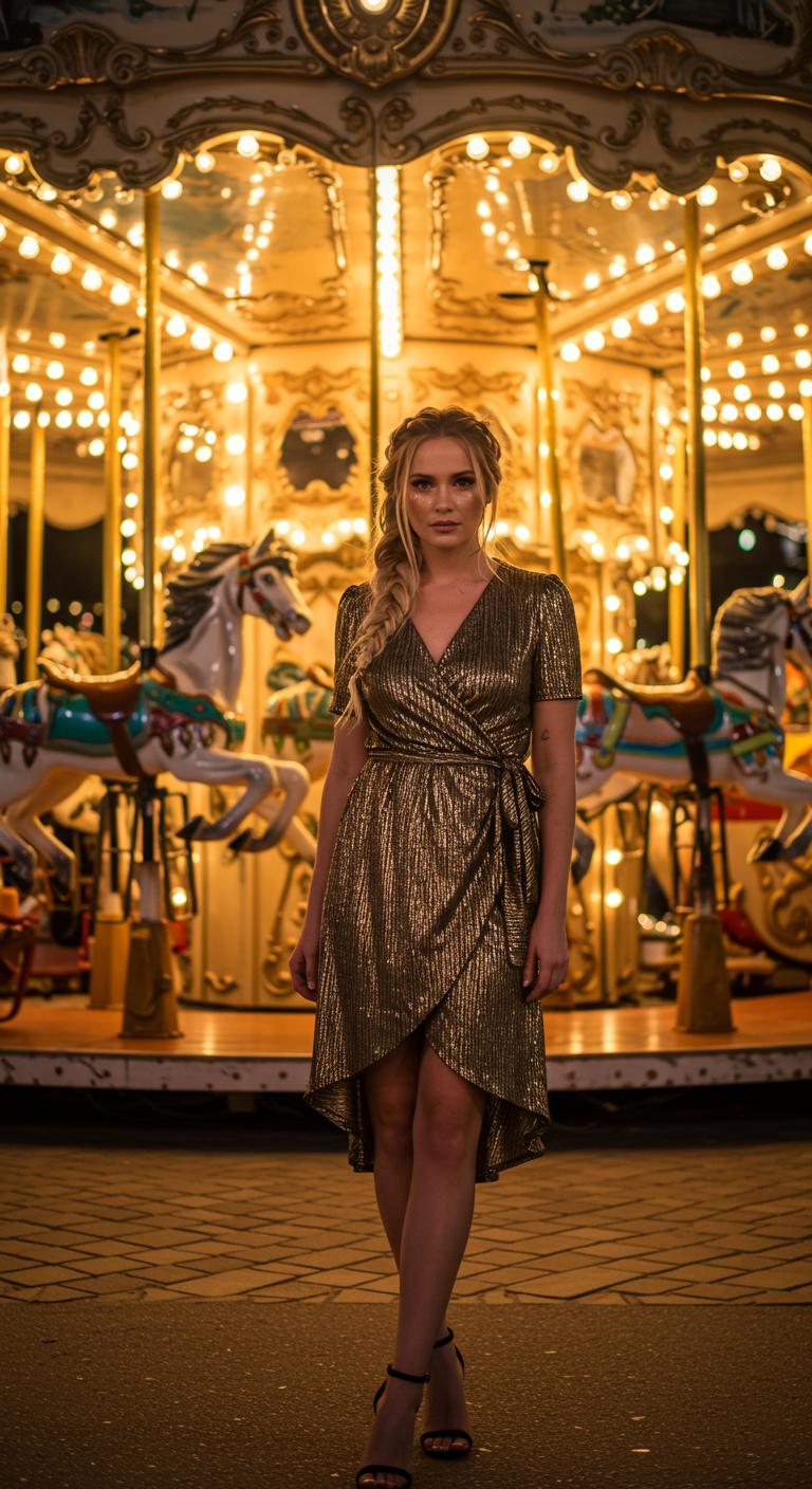 Perfect for cooler evening events or festive gatherings, this metallic wrap dress offers a sophisticated shimmer. The rich gold hue and textured fabric create a striking visual, while the V-neckline and adjustable tie waist flatter various body types, particularly hourglass or pear shapes by accentuating the waist. Its high-low hem adds a playful yet elegant touch, making it ideal for cocktail parties, holiday celebrations, or a chic night out.