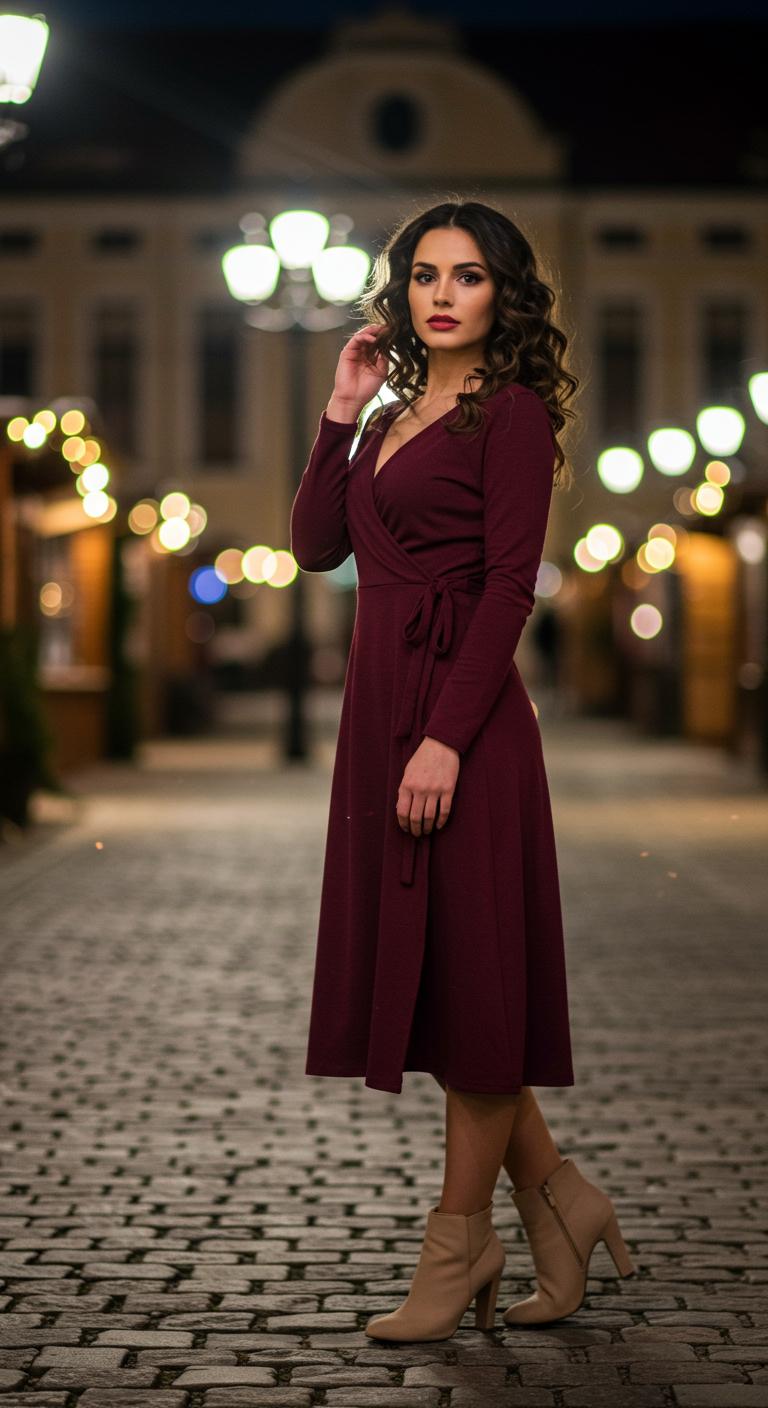 Exuding sophisticated charm, this outfit centers on a rich burgundy midi-length wrap dress. The V-neckline and tie-waist detail flatter various body types, particularly accentuating an hourglass figure or creating definition for straighter silhouettes. Paired with neutral ankle boots, the ensemble achieves a balanced, refined aesthetic perfect for an evening out, a semi-formal gathering, or a stylish dinner date.