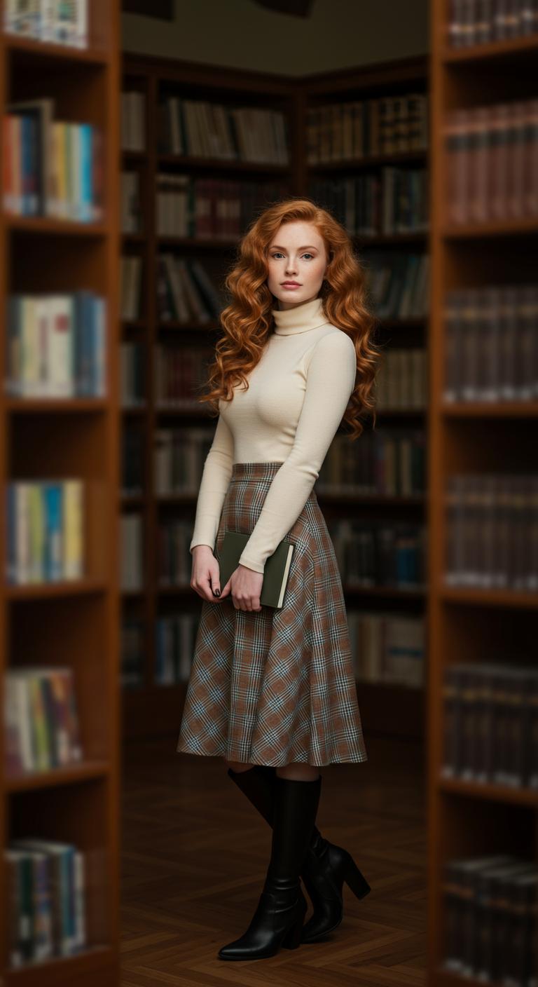 Layering a fitted turtleneck beneath a voluminous midi skirt creates a balanced and sophisticated silhouette. The creamy knit top provides a soft contrast to the rich, plaid-patterned skirt, which features warm brown and subtle blue tones that are perfect for cooler weather. This smart-casual pairing, complemented by knee-high boots, offers a refined aesthetic ideal for those who appreciate classic style with a modern twist, suitable for intellectual pursuits or stylish daytime events.