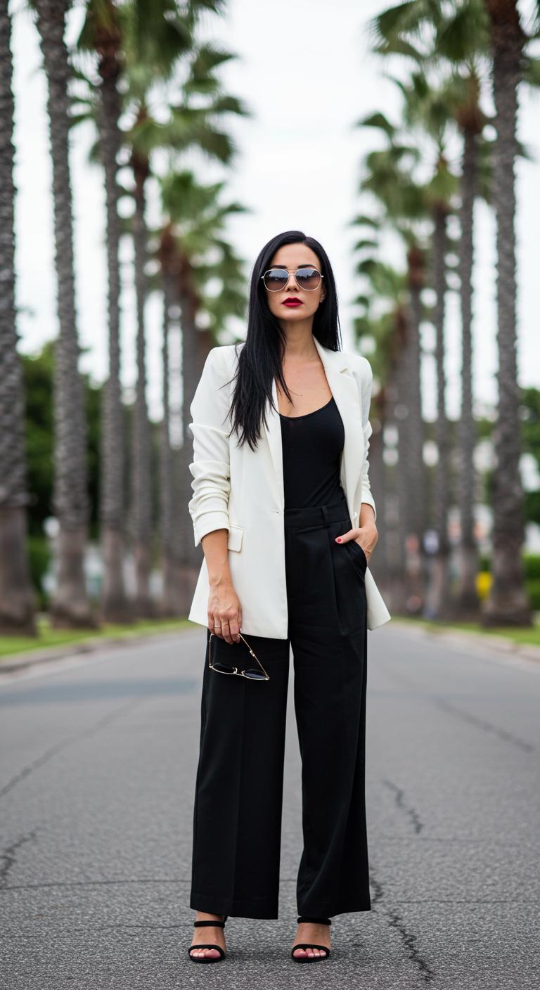 The striking contrast of a crisp white blazer over an all-black foundation creates an effortlessly chic and sophisticated aesthetic. This versatile combination features wide-leg trousers that offer comfort and a flattering silhouette, especially for those with a pear or hourglass figure, while the simple black camisole maintains a sleek profile. Ideal for a business casual setting, a professional event, or an elevated evening out, this ensemble epitomizes understated elegance with a contemporary edge.
