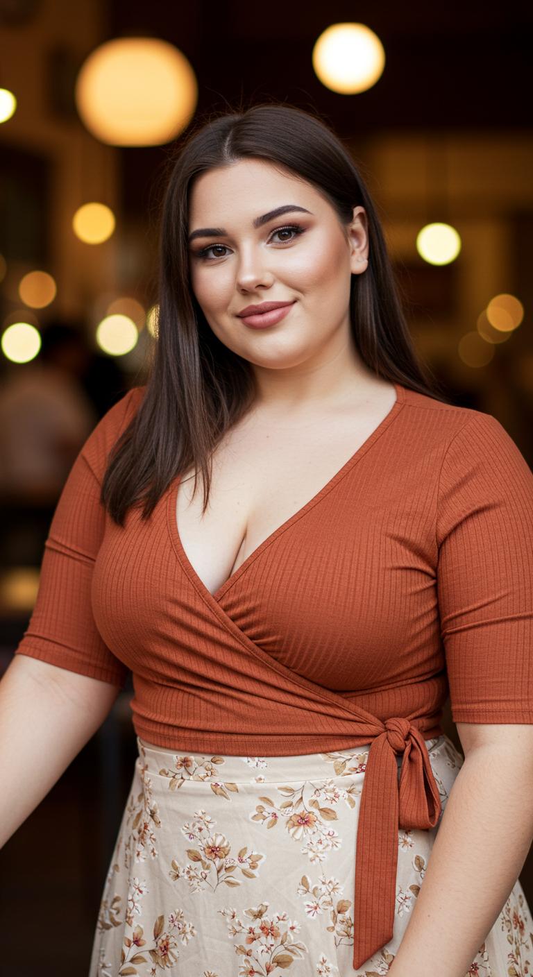 The unique interplay of a rich rust-colored ribbed wrap top with a delicate floral print midi skirt creates a harmonious and inviting aesthetic. This combination beautifully accentuates an hourglass or pear body shape, offering a flattering silhouette with its defined waistline. The earthy tones and subtle texture variations make it an excellent choice for a casual brunch, an afternoon outing, or a relaxed evening gathering, appealing to those who favor a blend of comfort and understated elegance.