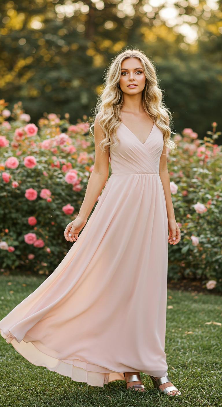 The delicate chiffon fabric of this maxi dress drapes beautifully, creating an ethereal and flowing silhouette. Its soft blush hue, coupled with a flattering V-neckline and cinched waist, offers a universally appealing aesthetic that complements various body types, especially pear and hourglass figures looking for graceful elongation. This ensemble is perfect for spring or summer garden parties, outdoor weddings, or any sophisticated daytime event where a touch of romantic charm is desired. The gentle movement and subtle shimmer of the material ensure a captivating presence without overpowering the wearer.
