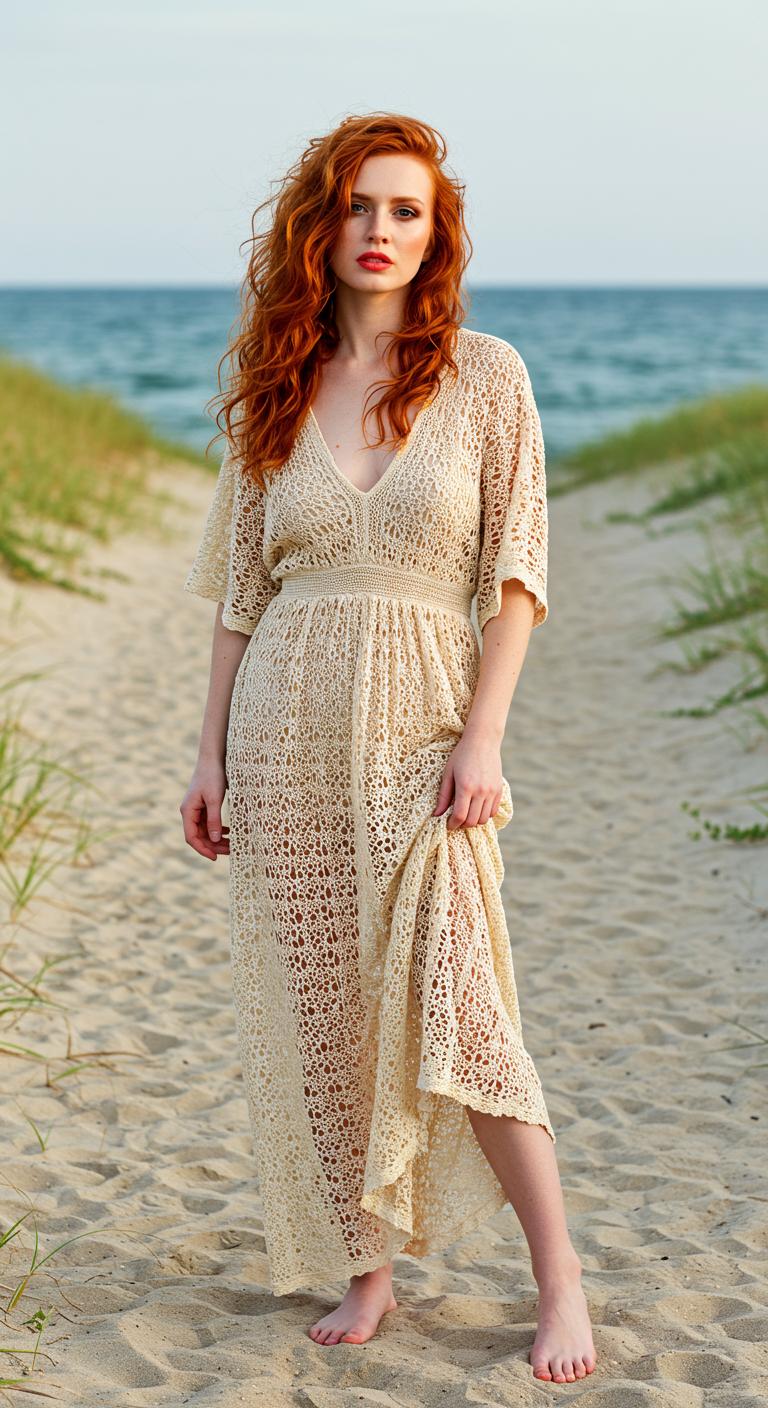 Evoking a laid-back 1970s bohemian vibe, this floor-length crocheted dress in a warm cream hue captures effortless summer elegance. The delicate open-knit pattern provides an airy feel, complemented by the comfortable v-neckline and relaxed kimono sleeves. With its empire waist and flowing silhouette, this piece flatters most body types, particularly those seeking a relaxed, romantic aesthetic for beachside events or casual resort wear.