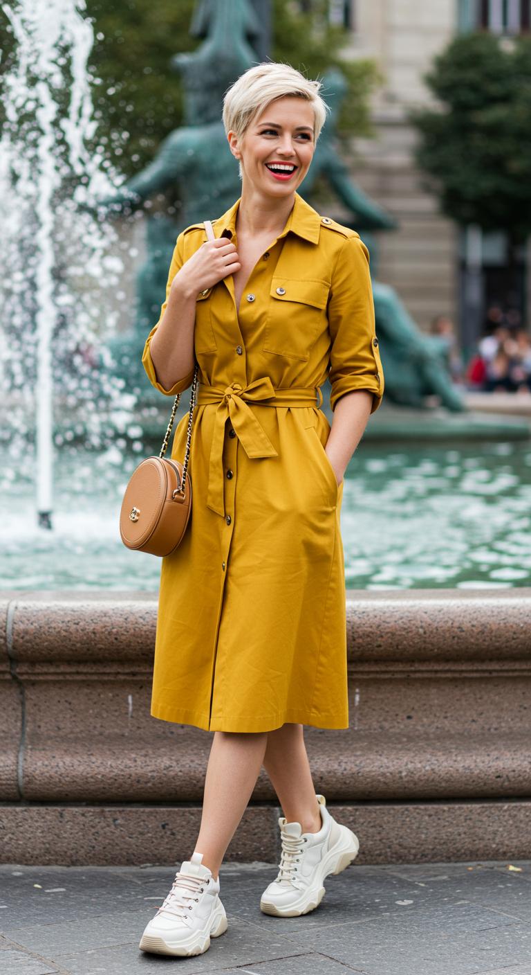 The vibrant mustard yellow of the utility dress, paired with the creamy white chunky sneakers and a rich tan crossbody bag, creates a striking yet harmonious color story. This midi-length dress, cinched at the waist, offers a flattering silhouette that suits various body types, particularly enhancing an hourglass or pear shape by accentuating the waist. Its relaxed yet polished aesthetic makes it perfect for a stylish daytime event, a casual city stroll, or an elevated weekend brunch. The combination of a structured dress with sporty footwear provides a modern, comfortable, and effortlessly chic look for the fashion-conscious woman.