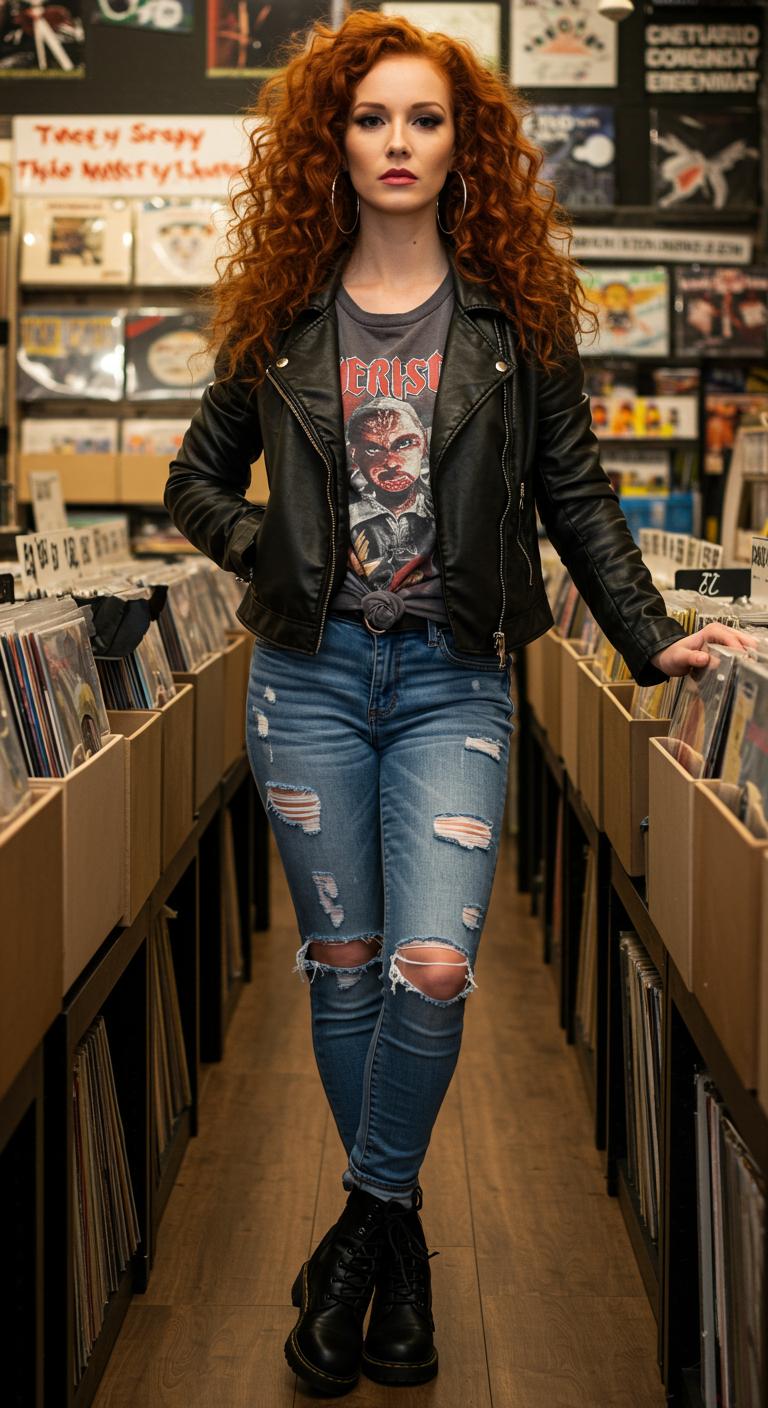 Perfect for a casual outing to a record store or an evening concert, this ensemble exudes effortless cool. The distressed skinny jeans, paired with a graphic band tee tied at the waist, create a relaxed yet edgy foundation. A classic black leather moto jacket adds structure and a touch of rebellious charm, while sturdy lace-up boots complete the urban aesthetic. This outfit works well for those with a bold personal style who appreciate comfort without compromising on attitude.