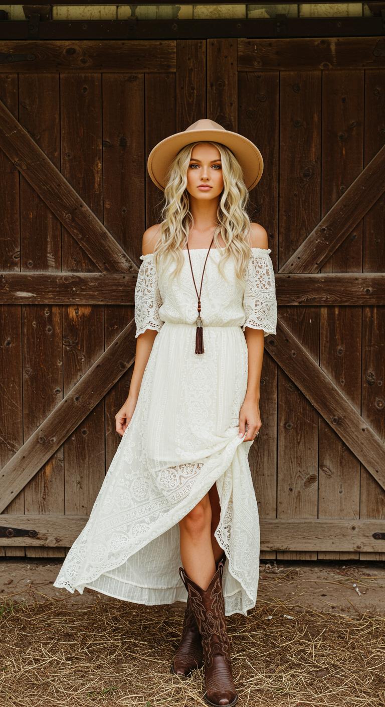 Styling an off-the-shoulder lace maxi dress with rugged cowboy boots creates an intriguing contrast, blending delicate femininity with a touch of Americana. The creamy white dress, with its intricate patterns and flowing silhouette, offers a relaxed yet elegant feel. This ensemble is ideal for those with a free-spirited personal style, complementing various body types by highlighting the shoulders and cinching at the waist. It works beautifully for outdoor events, casual summer gatherings, or even a chic daytime festival.