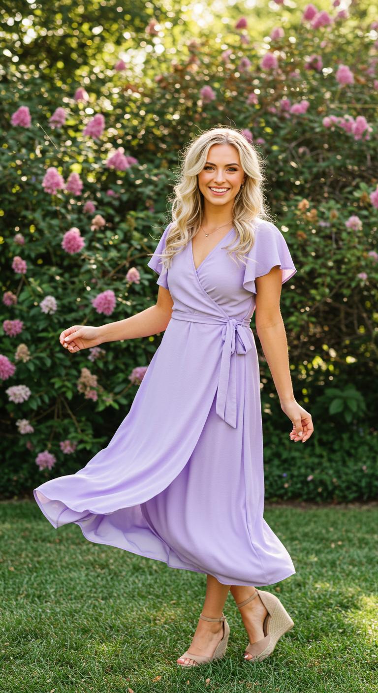 Inspired by the effortless grace of resort wear, this lilac wrap dress offers a fluid silhouette that flatters a range of body types, particularly those seeking to highlight their waistline. The soft, flowing fabric and delicate flutter sleeves create a romantic and airy feel, making it ideal for warmer weather. Paired with espadrille wedges, this ensemble is perfect for garden parties, brunches, or a stylish daytime event, exuding a refined yet relaxed charm.