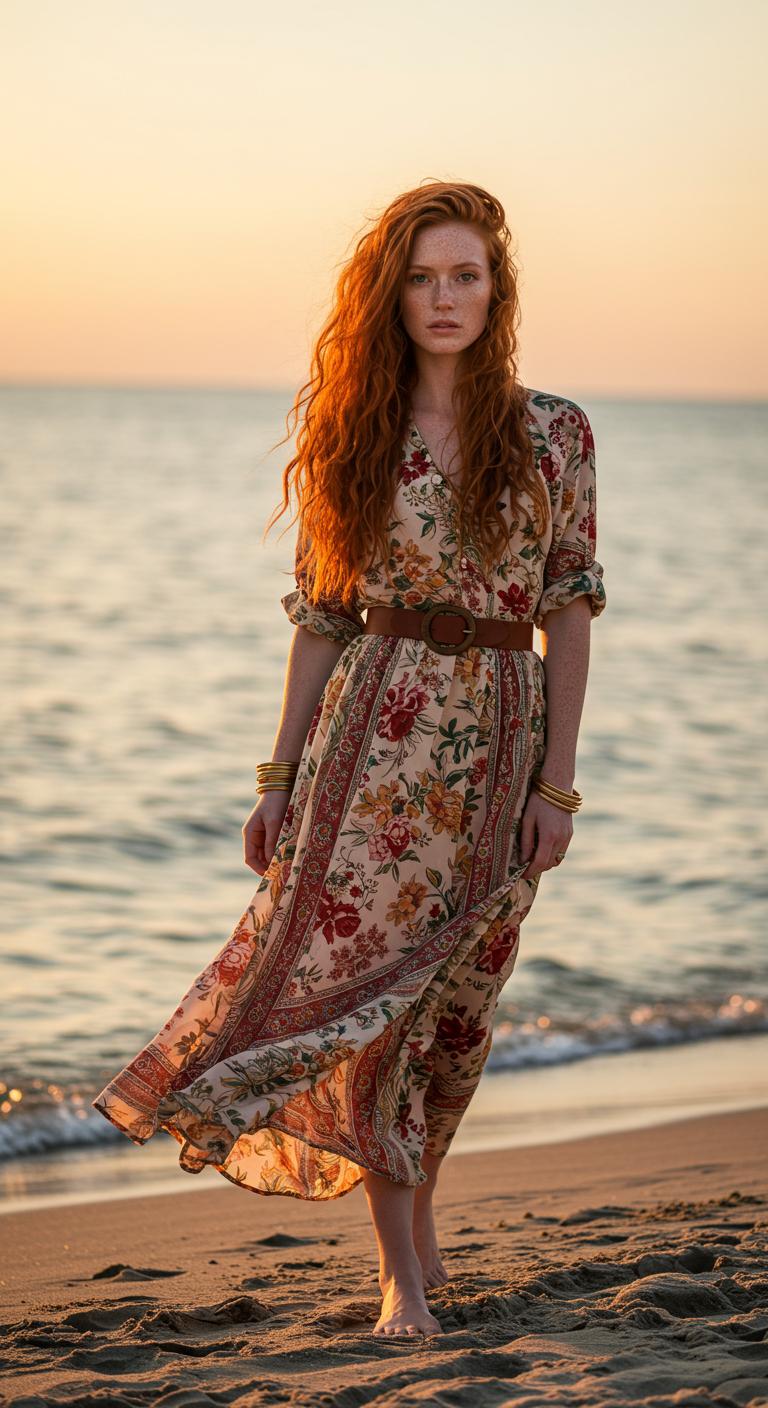 The intricate floral and paisley print on this maxi dress immediately draws the eye, featuring a rich palette of earthy tones and deep reds against a light background. Cinching at the waist with a wide, brown belt, the silhouette is both flattering and comfortable, ideal for pear or hourglass figures seeking an elegant, relaxed aesthetic. The flowing fabric and half-sleeves with a subtle cuff contribute to its effortless appeal, perfect for a casual outdoor event or a stylish resort evening. The overall effect is one of serene, bohemian chic, making it a versatile choice for women who appreciate comfort without compromising on sophisticated design.