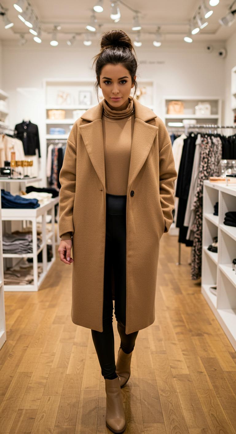 Exuding understated elegance, this outfit perfectly blends comfort with modern sophistication. A luxurious camel-colored longline coat, featuring a relaxed fit, layers seamlessly over a matching turtleneck, creating a cohesive and warm top half. The sleek black faux leather leggings offer a striking contrast in texture and color, providing a contemporary edge that flatters various body types by creating a streamlined silhouette. Completing the look are neutral-toned ankle boots, making this ensemble ideal for a stylish city outing, casual business meeting, or an upscale shopping trip.
