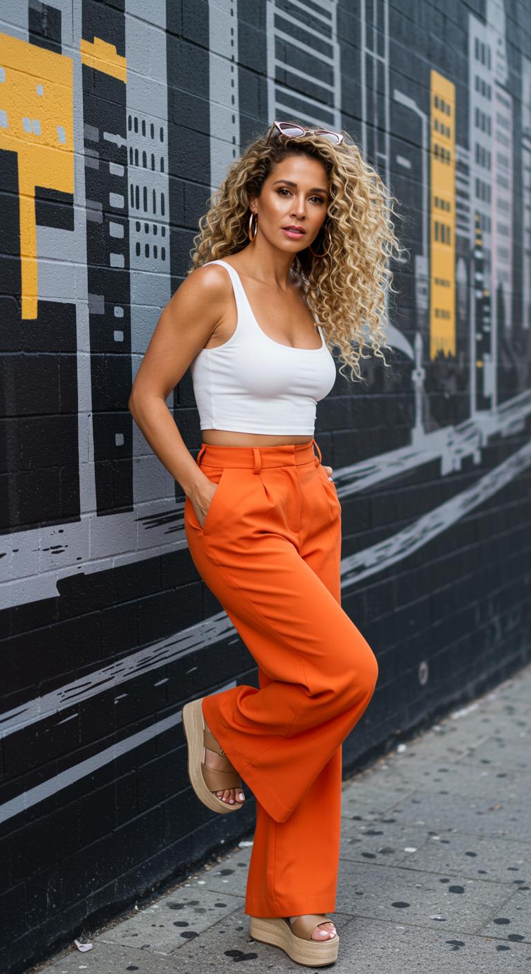 The striking contrast of bright orange and crisp white immediately captures attention, creating a dynamic and fresh aesthetic. Wide-leg trousers in a bold hue paired with a simple fitted crop top offer a balanced silhouette that flatters many body types, particularly those seeking to elongate their legs. This ensemble, completed with platform sandals, is ideal for a stylish brunch, a casual art gallery visit, or an afternoon of urban exploration.