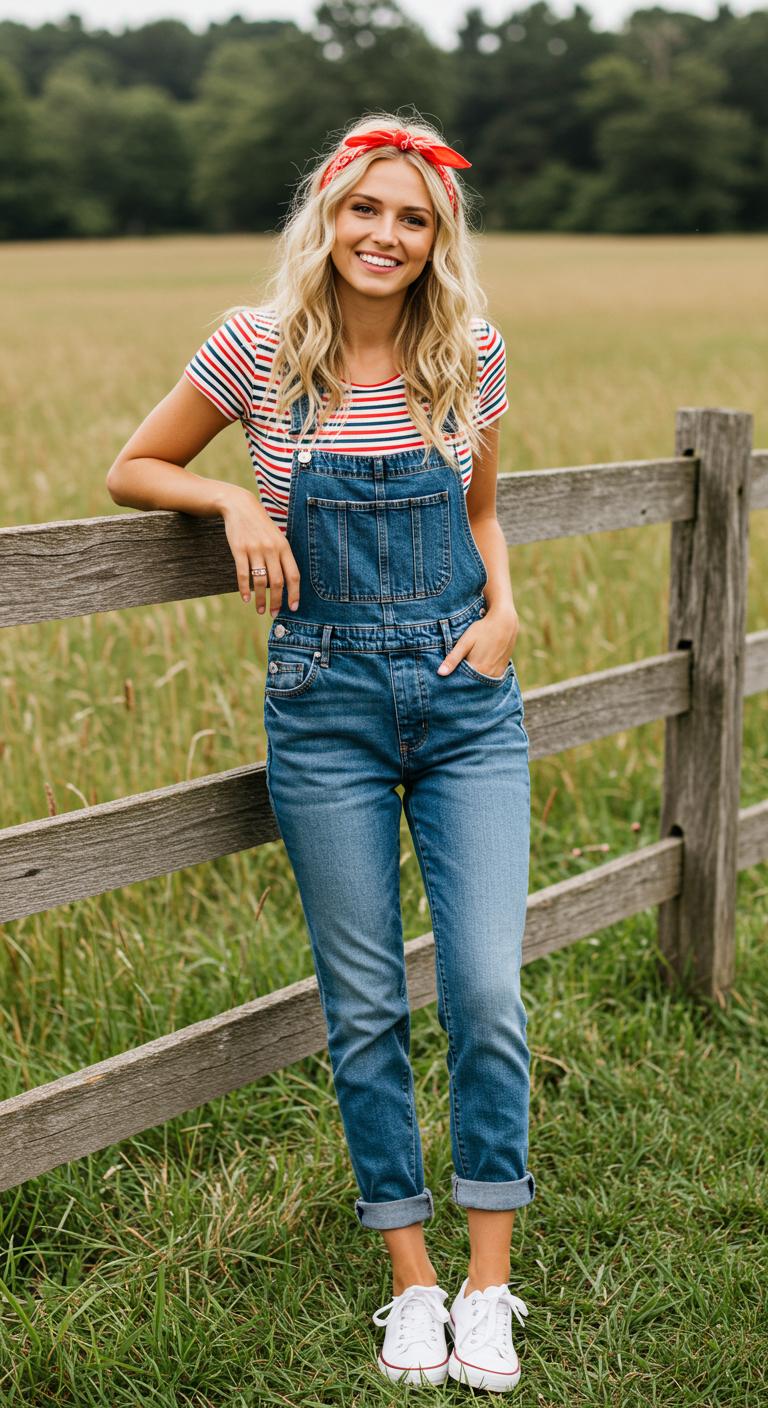 The enduring appeal of denim overalls takes center stage, offering a relaxed yet put-together aesthetic. This outfit effectively combines the classic blue denim with a vibrant red and white striped tee, creating a playful contrast that suits various casual settings. The relaxed fit of the overalls, with their cuffed hems, complements a range of body types, providing comfort and ease of movement. This look is ideal for outdoor activities, weekend errands, or a laid-back gathering with friends.