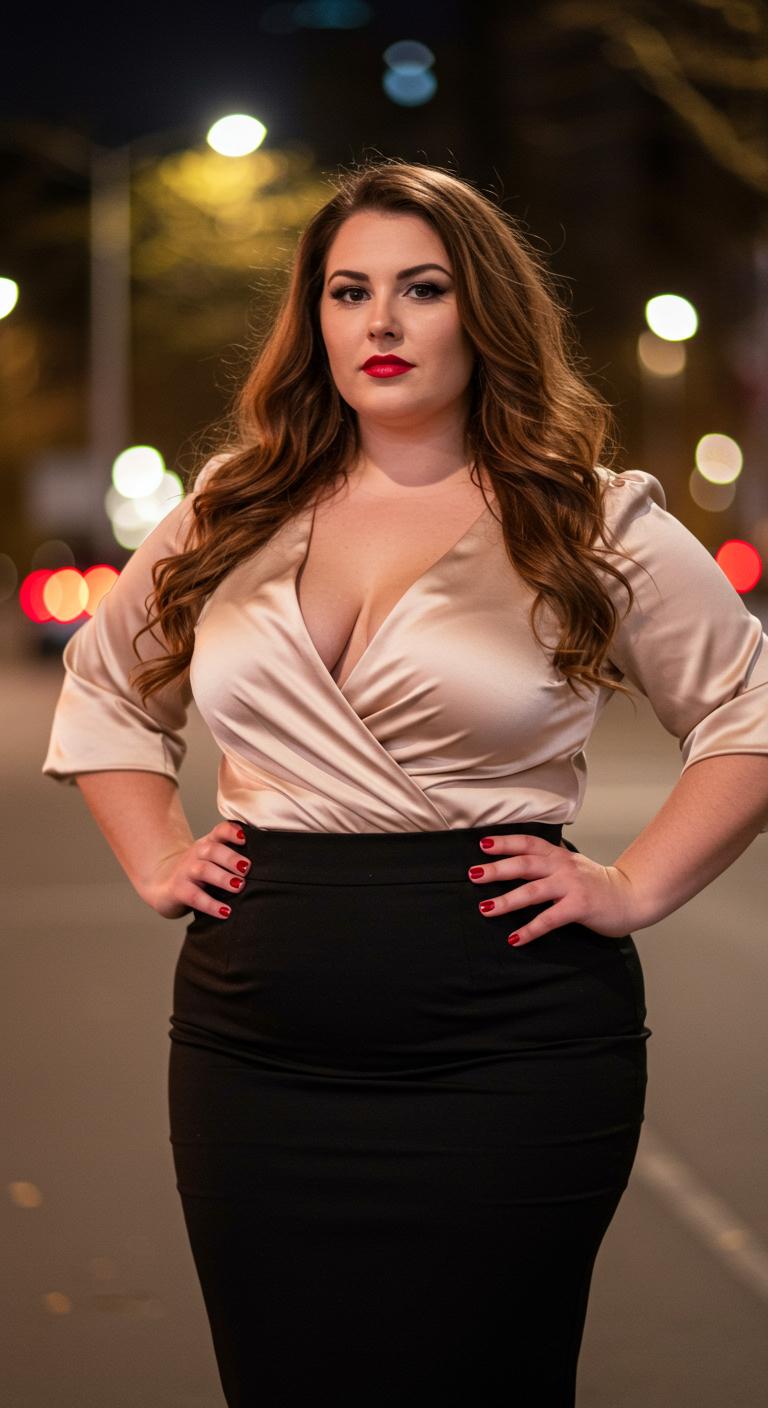 Perfect for cooler evenings or sophisticated indoor events, this ensemble pairs a lustrous champagne satin wrap top with a sleek black pencil skirt. The top’s flattering V-neckline and draped fabric create an elegant silhouette, complementing various body types by accentuating the waist and decolletage. The classic black skirt offers a polished foundation, making this an ideal choice for a formal dinner, an upscale cocktail party, or a professional networking event where making a strong impression is key.