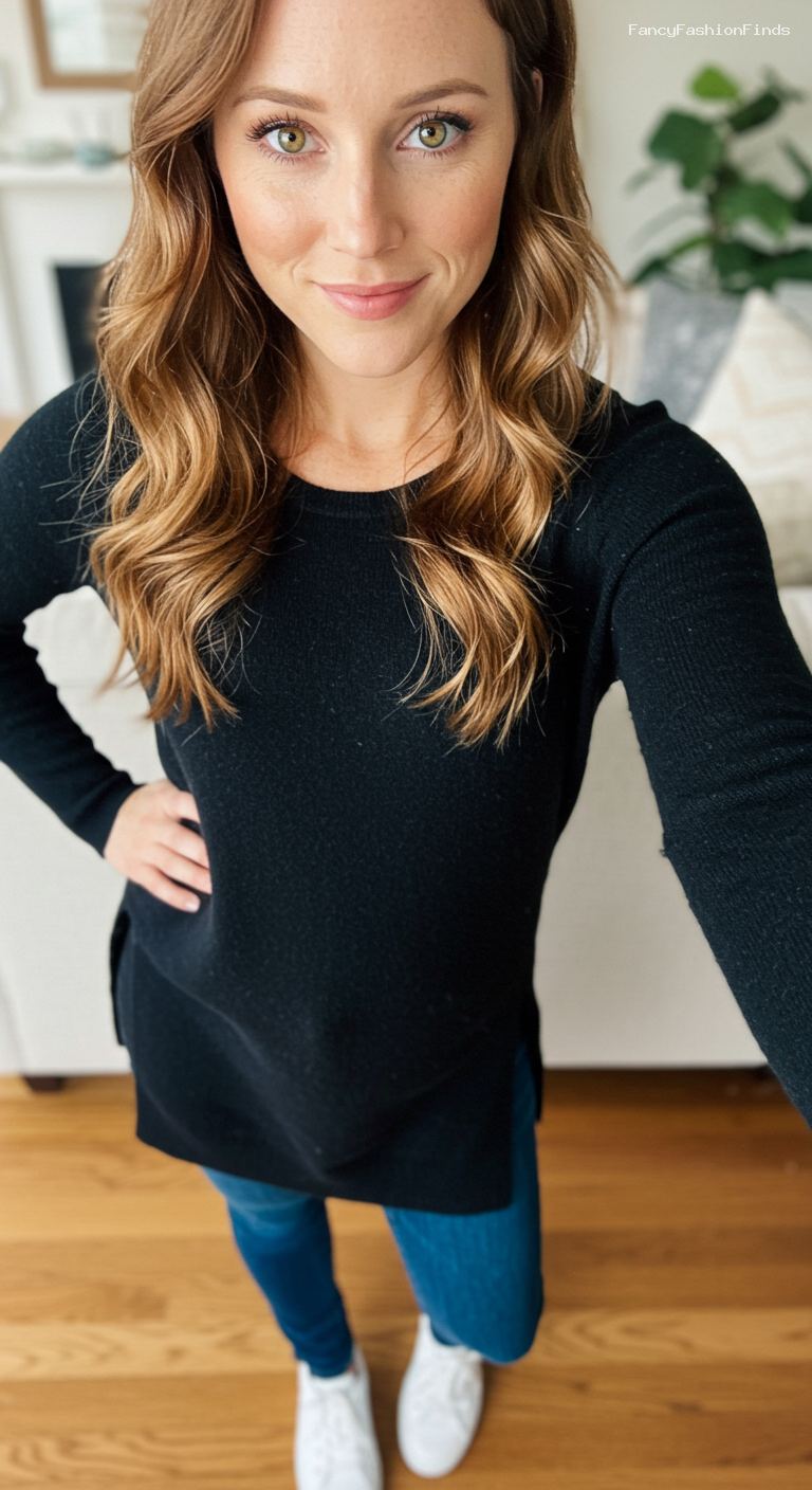 The textured black tunic, with its subtle waffle knit, offers a comfortable yet polished foundation for a casual ensemble. This versatile piece pairs seamlessly with form-fitting blue jeans, creating a balanced silhouette that flatters various body types, particularly those seeking a relaxed fit through the torso. White sneakers complete the look, injecting a touch of modern simplicity. Ideal for relaxed weekend outings, casual work environments, or running errands, this outfit embodies a minimalist aesthetic with maximum comfort.