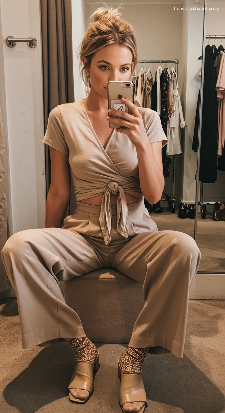 The monochromatic taupe ensemble creates a polished and cohesive aesthetic, setting a sophisticated tone for professional settings. A wrap-style crop top with a front tie detail pairs seamlessly with a high-waisted pencil skirt, offering a modern take on business attire. This outfit is particularly flattering for hourglass figures, accentuating the waist, and is ideal for business meetings, conferences, or upscale office environments where a blend of formality and contemporary style is desired.